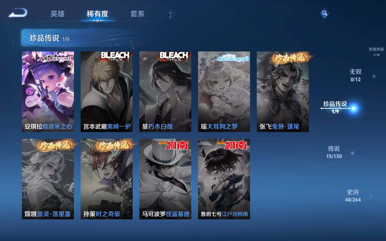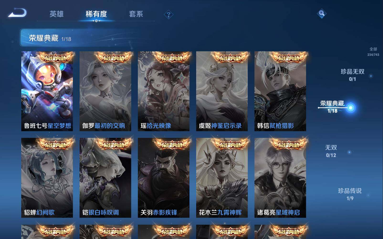 狂铁御狮,米莱狄御霄,牛魔御旌,盾山御銮,夏侯惇朔风刀,明世隐疑决卦,老夫子醍醐杖,鬼谷子原初探秘者,狄仁杰万华元夜,程咬金演武夺筹,钟馗驱傩正仪,钟馗神迹守卫,鲁班七号狮舞东方,沈梦溪星空之诺,李元芳银河之约,刘邦夺宝奇兵,弈星混沌棋,达摩沙漠行僧,兰陵王金庭之子,沈梦溪大漠名商,李元芳云中旅人,桑启海盐诗旅,裴擒虎擒涛扼浪,鲁班大师探海日志,张良古海寻踪