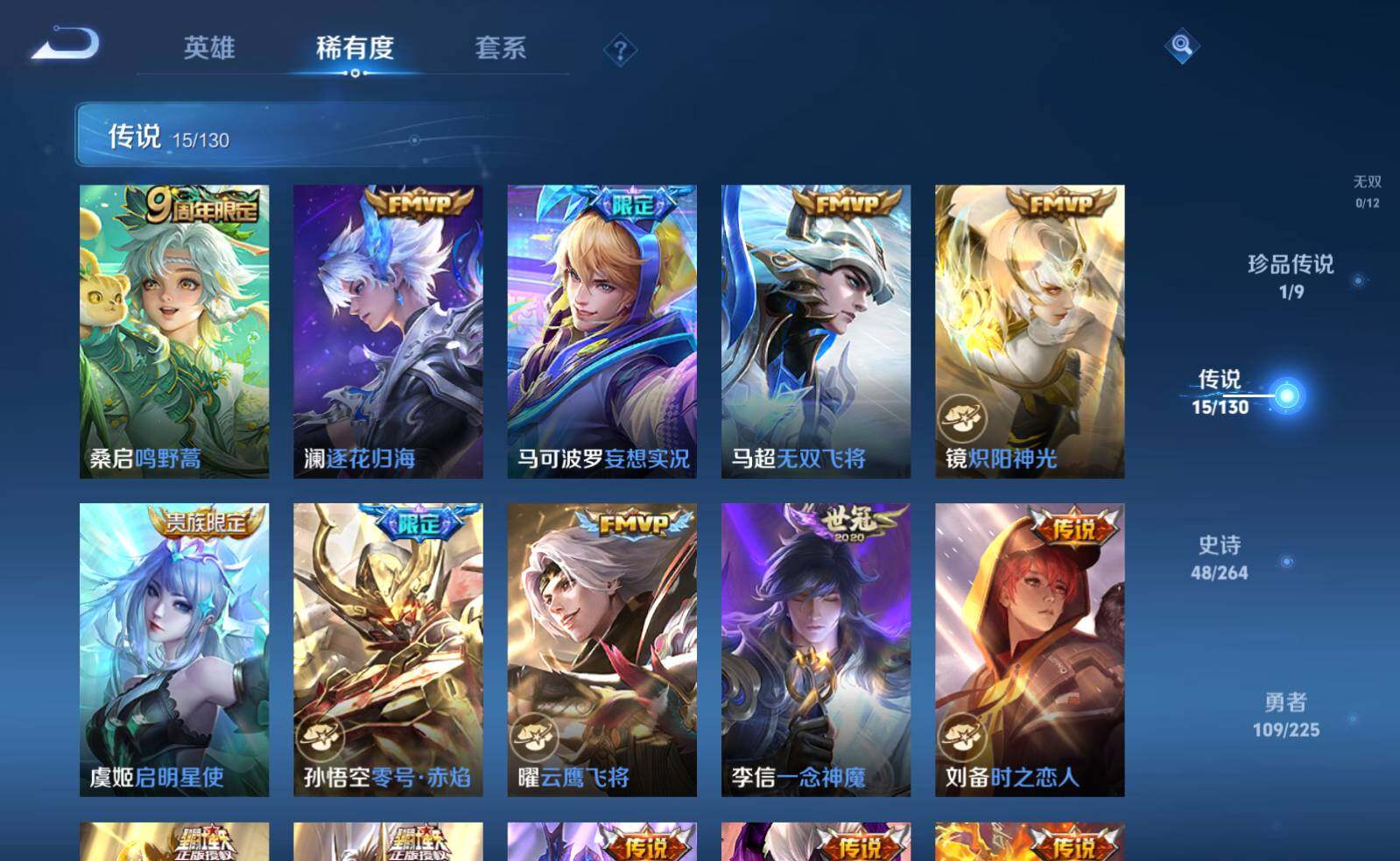 【传说皮肤】:桑启鸣野蒿,澜逐花归海,马可波罗妄想实况,马超无双飞将,镜炽阳神光,虞姬启明星使,孙悟空零号赤焰,曜云鹰飞将,李信一念神魔,刘备时之恋人,达摩黄金狮子座,后羿黄金射手座,貂蝉仲夏夜之梦,宫本武藏地狱之眼,孙悟空地狱火