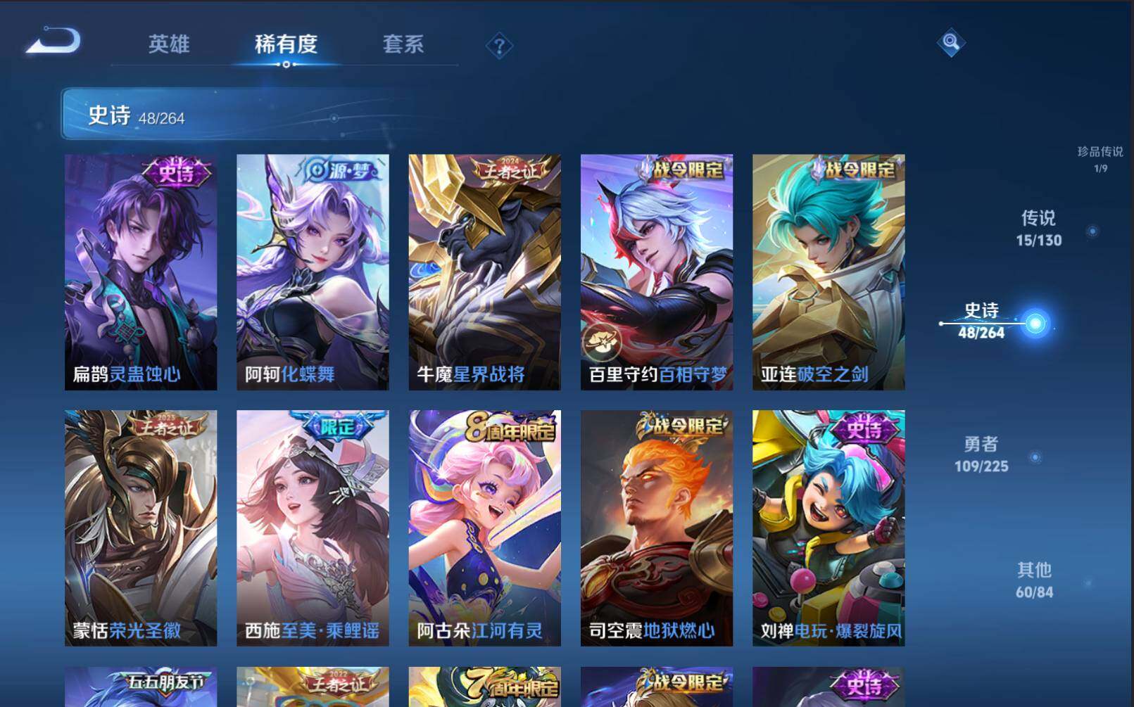 【赛季限定】:夏侯惇朔风刀,狄仁杰万华元夜,达摩沙漠行僧,老夫子醍醐杖,程咬金演武夺筹,兰陵王金庭之子,张良古海寻踪,牛魔御旌,李元芳云中旅人,钟馗驱傩正仪,鬼谷子原初探秘者,弈星混沌棋,梦奇顽趣,沈梦溪大漠名商,明世隐疑决卦,裴擒虎擒涛扼浪,狂铁御狮,米莱狄御霄,盾山御銮,鲁班大师探海日志,桑启海盐诗旅,鬼谷子天穹祈灯,蒙恬荣光圣徽,刘邦剑破天穹,姜子牙天穹之誓