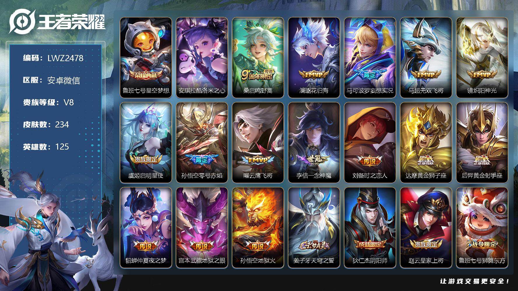 [12954998]安卓WX-V8-永恒钻石V段位-125英雄-234皮肤-1典藏-0珍品无双-0无双-1珍品传说-15传说-48史诗 【荣耀典藏】:鲁班七号星空梦想 【珍品传说】:安琪拉酷洛米之心 【传说皮肤】:桑启鸣野蒿,澜逐花归海,马可波罗妄想实况,马超无双飞将,镜炽阳神光,虞姬启明星使,孙悟空零号赤焰,曜云鹰飞将,李信一念神魔,刘备时之恋人,达摩黄金狮子座,后羿黄金射手座,貂蝉仲夏夜之梦,宫本武藏地狱之眼,孙悟空地狱火 【限定皮肤】:姜子牙天穹之誓,狄仁杰阴阳师,赵云皇家上将,鲁班七号狮舞东方,阿轲迷踪丽影,钟无艳超时空战士,夏侯惇朔风刀,甄姬落雪兰心,马可波罗妄想实况,狄仁杰魔术师,狄仁杰万华元夜,达摩沙漠行僧,项羽海滩派对,老夫子醍醐杖,程咬金演武夺筹,刘邦夺宝奇兵,韩信飞衡,兰陵王金庭之子,孙悟空零号赤焰,牛魔御旌,刘备百相守梦,李元芳银河之约,李元芳云中旅人,虞姬启明星使,钟馗神迹守卫,钟馗驱傩正仪,干将莫邪胡桃夹子,鬼谷子原初探秘者,鬼谷子五谷丰年,弈星混沌棋,梦奇顽趣,沈梦溪星空之诺,沈梦溪大漠名商,明世隐疑决卦,裴擒虎李小龙,裴擒虎擒涛扼浪,狂铁御狮,米莱狄御霄,盾山御銮,上官婉儿梁祝,西施至美乘鲤谣,鲁班大师探海日志,桑启海盐诗旅,艾琳流音漫舞,司空震地狱燃心,阿古朵江河有灵,张良古海寻踪,蒙恬荣光圣徽,鬼谷子天穹祈灯,沈梦溪龙舞盛年,刘邦剑破天穹,程咬金群星魔术团,周瑜熔金海岸 【年限皮肤】:韩信飞衡 【赛季限定】:夏侯惇朔风刀,狄仁杰万华元夜,达摩沙漠行僧,老夫子醍醐杖,程咬金演武夺筹,兰陵王金庭之子,张良古海寻踪,牛魔御旌,李元芳云中旅人,钟馗驱傩正仪,鬼谷子原初探秘者,弈星混沌棋,梦奇顽趣,沈梦溪大漠名商,明世隐疑决卦,裴擒虎擒涛扼浪,狂铁御狮,米莱狄御霄,盾山御銮,鲁班大师探海日志,桑启海盐诗旅,鬼谷子天穹祈灯,蒙恬荣光圣徽,刘邦剑破天穹,姜子牙天穹之誓 【战令限定】:鲁班七号狮舞东方,阿轲迷踪丽影,钟无艳超时空战士,甄姬落雪兰心,刘邦夺宝奇兵,艾琳流音漫舞,李元芳银河之约,钟馗神迹守卫,沈梦溪星空之诺,司空震地狱燃心 【史诗皮肤】:露娜紫霞仙子,赵云皇家上将,貂蝉圣诞恋歌,甄姬冰雪圆舞曲,狄仁杰魔术师,宫本武藏鬼剑武藏,孙尚香水果甜心,嬴政摇滚巨星,墨子金属风暴,李白千年之狐,吕布末日机甲,韩信白龙吟,花木兰水晶猎龙者,小乔缤纷独角兽,兰陵王暗隐猎