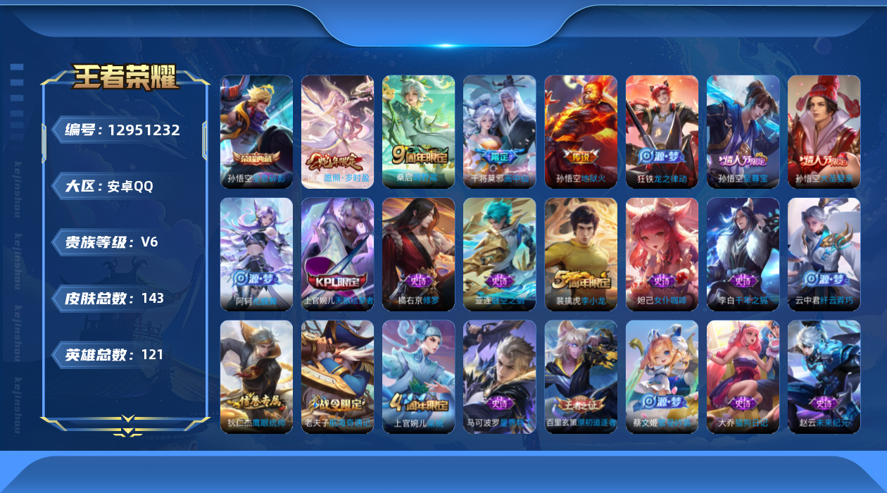 [12951232]【特价急出/详情看图】:安卓Q-V6-至尊星耀IV段位-121英雄-143皮肤-1典藏-4传说-33史诗