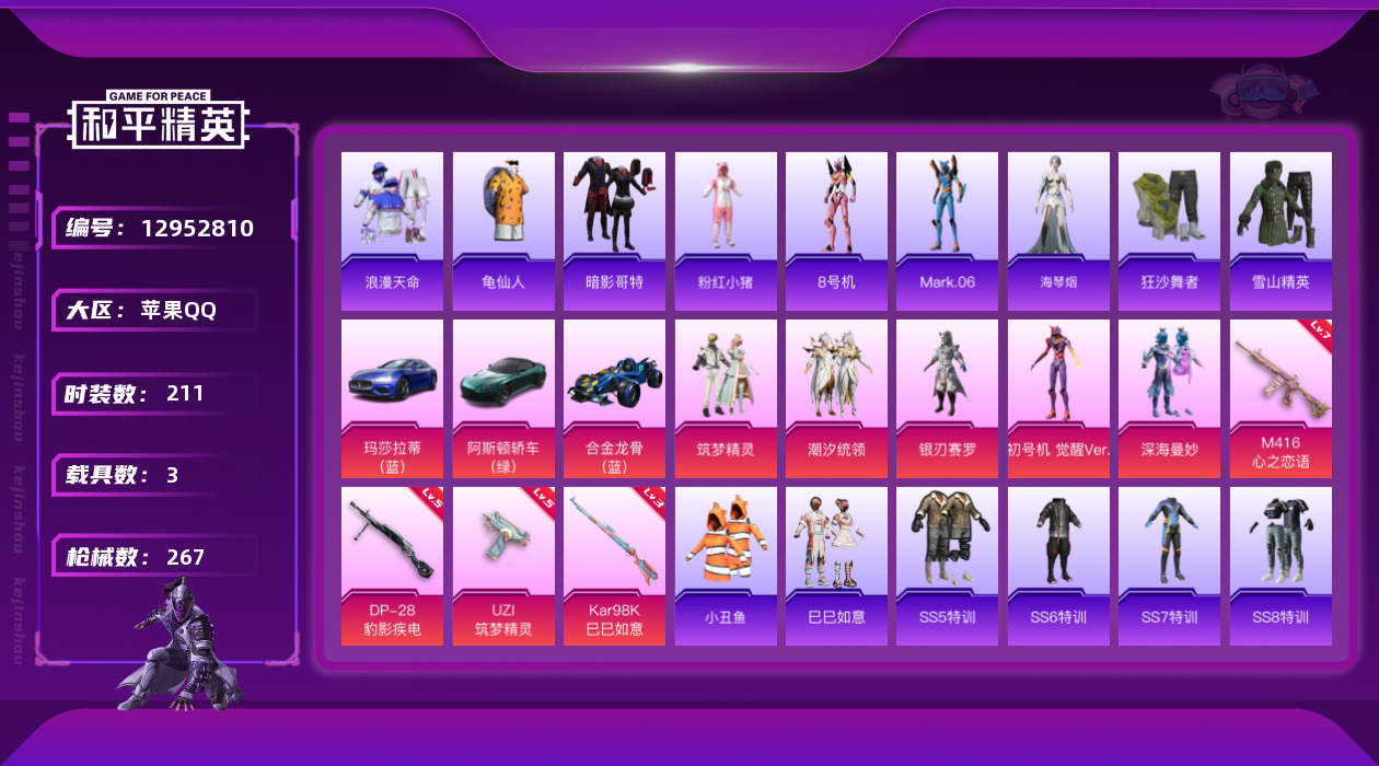 [12952810]素材身法号【特价急出/详情看图】:苹果 手Q-5粉装-4特效枪-3载具-1粉色飞行器-8.8w热力值-13王牌印记-211套装-267枪皮【热门品类】:套装-浪漫天命,套装-都市猎人,套装-小丑鱼,套装-奇异狩猎者,套装-浪客战士,旭日初心兜帽大衣,套装-龟仙人,套装-暗影哥特,套装-粉红小猪,角色-8号机,角色-Mark.06,小恶魔头饰【粉色载具】:阿斯顿马丁DBS(绿),玛莎拉蒂Ghibli(蓝),合金龙骨(蓝)【粉色套装】:粉装-深海曼妙,粉装-潮汐统领,粉装-银刃赛罗,粉装-筑梦精灵,角色-初号机 觉醒Ver.【粉色枪皮等级】:M416-心之恋语(七级),UZI-筑梦精灵(五级),Kar98K-巳巳如意(三级),DP-28-豹影疾电(五级)【粉色飞行器】:星之彼岸飞行器