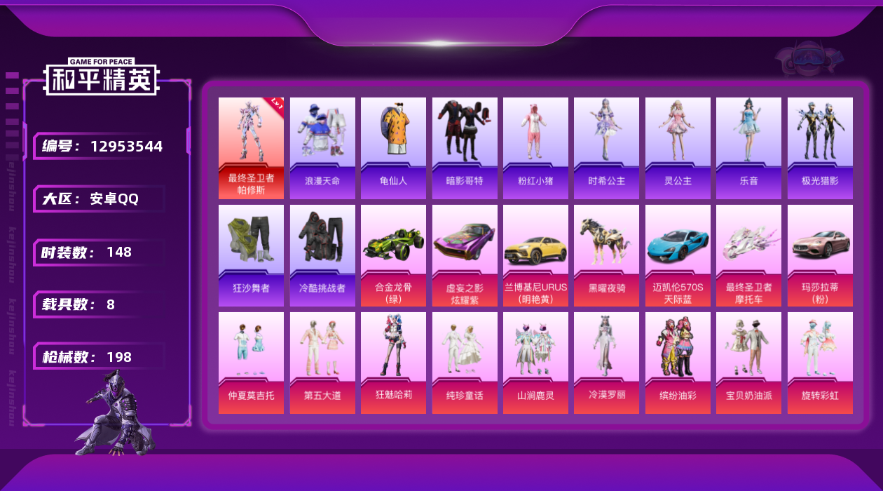 [12953544]素材身法号【特价急出/详情看图】:安卓 手Q-1神装-15粉装-9特效枪-8载具-4粉色飞行器-7.1w热力值-9王牌印记-148套装-198枪皮【红色神装等级】:最终圣卫者-帕修斯(一级)【热门品类】:粉装-梦幻火箭,粉装-缤纷油彩,套装-浪漫天命,套装-都市猎人,套装-深海小丑鱼,套装-小丑鱼,角色-军刀雅典娜,套装-胖达圆圆,套装-龟仙人,套装-暗影哥特,套装-粉红小猪【粉色载具】:兰博基尼URUS(明艳黄),玛莎拉蒂Ghibli(粉),迈凯伦570S(天际蓝),虚妄之影(炫耀紫),合金龙骨(绿),最终圣卫者摩托车,僚机-萌兔起飞,黑曜夜骑【粉色套装】:粉装-宝贝奶油派,粉装-梦幻火箭,粉装-缤纷油彩,粉装-新星烈龙,粉装-彩虹鹿灵,粉装-山涧鹿灵,粉装-鸾凤武仙,粉装-旋转彩虹,粉装-第五大道,粉装-纯珍童话,粉装-仲夏莫吉托,粉装-瑰丽时代,角色-樱桃泡泡,角色-狂魅哈莉,角色-冷漠罗丽【粉色枪皮等级】:AKM-星际浪客(四级),SCAR-L-甜梦小狐(五级),M416-灵猫魔法师(三级),GROZA-旋转彩虹(五级),P90-冷漠罗丽(四级),Kar98K-巳巳如意(五级),M417-第五大道(一级),MK12-雪月幻音(一级),DP-28-豹影疾电(五级)【粉色飞行器】:太空嘟嘟飞行器,纯梦嫁纱飞行翼,终晖之翼飞行器,灵猫魔法师飞行器