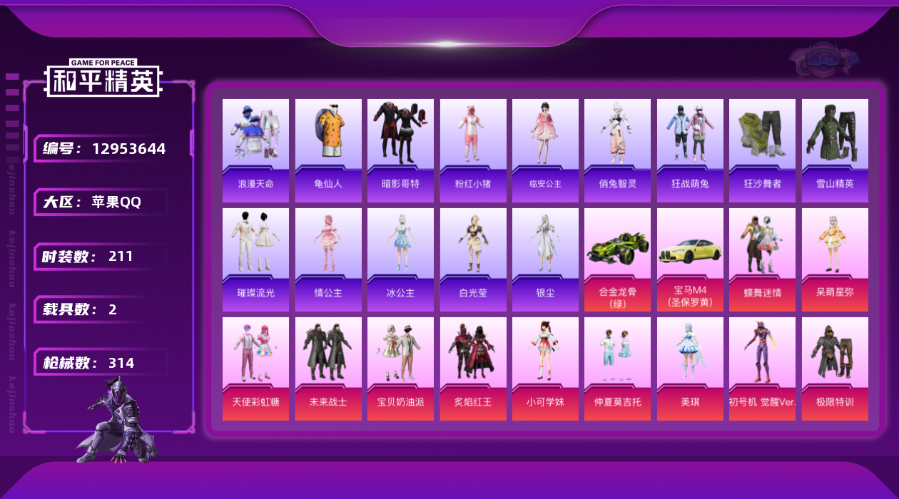 [12953644]素材身法号/地铁满天赋【特价急出/详情看图】:苹果 手Q-15粉装-10特效枪-2载具-7粉色飞行器-10.2w热力值-6王牌印记-211套装-314枪皮【热门品类】:粉装-梦幻火箭,套装-浪漫天命,套装-赤蝎幽灵,套装-都市猎人,套装-派对舞王,套装-深海小丑鱼,套装-小丑鱼,套装-奇异狩猎者,套装-胖达圆圆,套装-动感兔斯基人偶服,套装-龟仙人,套装-暗影哥特,套装-粉红小猪【粉色载具】:宝马M4(圣保罗黄),合金龙骨(绿)【粉色套装】:粉装-极限特训,粉装-未来战士,粉装-宝贝奶油派,粉装-天使彩虹糖,粉装-蝶舞迷情,粉装-梦幻火箭,粉装-新星烈龙,粉装-炙焰红王,粉装-香水柠檬,粉装-星之彼岸,粉装-仲夏莫吉托,角色-呆萌星弥,角色-小可学妹,角色-美琪,角色-初号机 觉醒Ver.【粉色枪皮等级】:SCAR-L-童趣迷兔(七级),SCAR-L-锦绣绵绵(五级),M416-心之恋语(一级),M416-暖熊萌萌(七级),GROZA-镜光银凌(五级),AUG-星之彼岸(六级),AUG-暖羊咩咩(五级),Kar98K-巳巳如意(五级),Mk14-甜梦熊击(五级),DP-28-豹影疾电(五级)【粉色飞行器】:星之彼岸飞行器,闪光银龙飞行器,超新星飞行器,沙丘之主天马,繁龙极客飞行器,镜域双华-灵镜之阶,圣域金龙飞行器