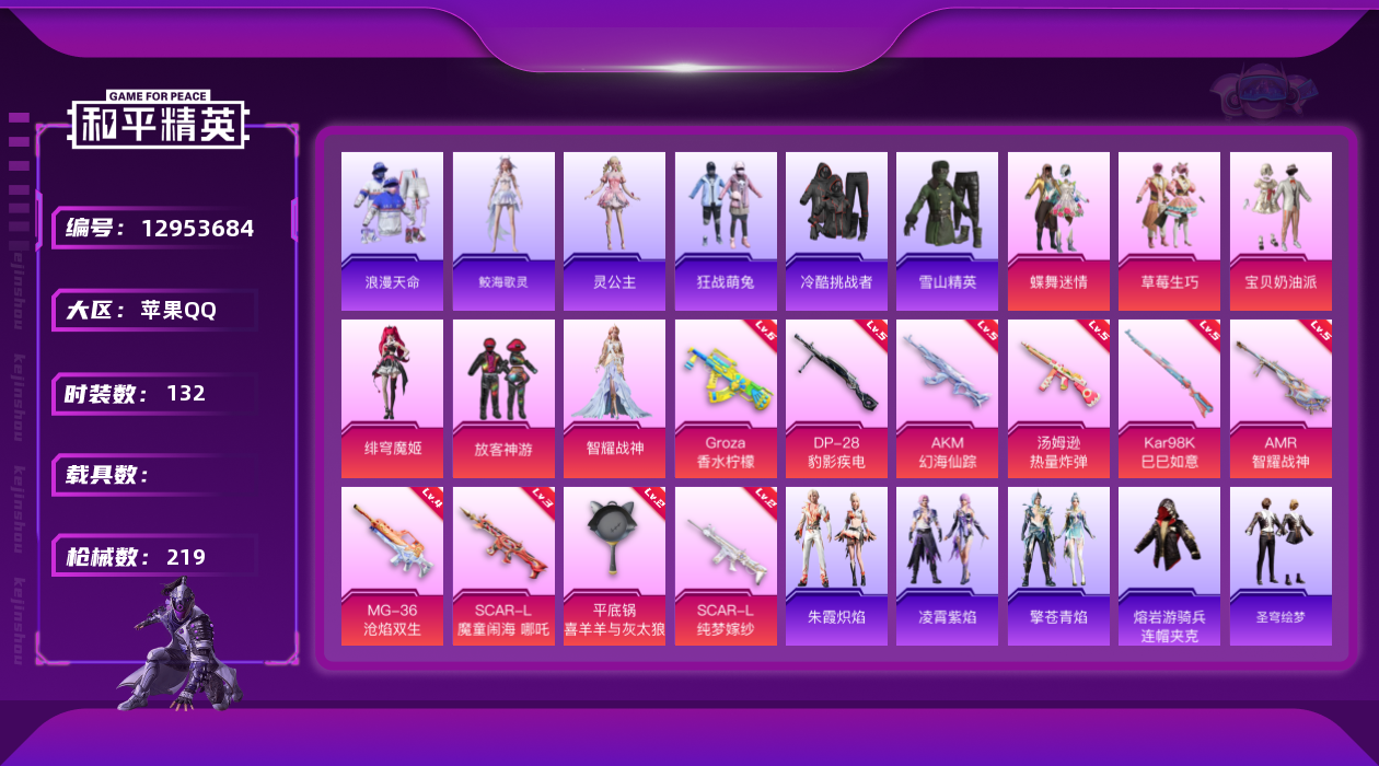 - [11637438]实名: 可修改 时装数: 614 载具数: 1 枪械数: 233 战备数: 162 热门装扮: 梦幻火箭(新101),深海小丑鱼,宝贝奶油派,浪漫波比,天使彩虹糖,黄伞悠悠,苍蓝魅影,草莓生巧,炙焰红王,冰霜白皇,炙焰赤龙,飓风飞鹰,林间仙鹿,彩虹鹿灵,洛天依,筑梦精灵,仓鼠灰灰,奶芙汪汪,动感兔斯基,炫光之旅,暗夜魅影,千金淑猫,宁雨蝶 载具: 玛莎拉蒂Ghibli(粉) 稀有枪皮: MG3洛神天依,SCAR-L童趣迷兔,M416风花雪月,GROZA-镜光银凌,Kar98K-巳巳如意,AUG-暖羊咩咩,MK12-雪月幻音,DP-28-豹影疾电