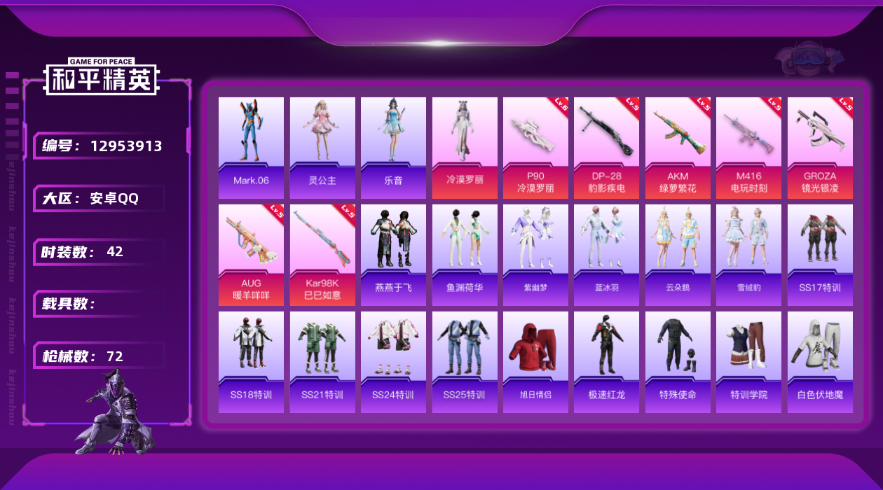 - [12455461]【商品标题】:苹果 手Q-0粉装-4特效枪-0载具-0粉色飞行器-24684热力值-4王牌印记-46套装-72枪皮 【热门品类】:套装-赤蝎幽灵,套装-都市猎人,套装-派对舞王,套装-龟仙人,套装-暗影哥特,套装-粉红小猪 【粉色枪皮等级】:M416-至情至圣(九级),蜜獾-辉耀战甲(六级),Kar98K-巳巳如意(五级),DP-28-豹影疾电(五级) 【粉色枪皮】:M416-至情至圣,蜜獾-辉耀战甲,Kar98K-巳巳如意,DP-28-豹影疾电 【粉色降落伞】:千金淑猫降落伞,幻影飞狐降落伞 【稀有套装】:套装-龟仙人,套装-雏菊兔兔,套装-萝兰蝴蝶,角色-狂花道·雅典娜,套装-糖糖葫芦,套装-青团波波,套装-燕燕于飞,套装-鱼渊荷华,角色-海琴烟,角色-灵公主 【稀有枪皮】:AKM-影袭,AKM-缤纷海域,AKM-玄冥寒域,M16A4-幻世战舞者,SCAR-L-炫彩节奏,GROZA-影袭,AUG-天降萌叽,AUG-甜蜜菠萝,AC-VAL-快闪甜心,UZI-啾咪啾咪,UZI-影袭,UMP45-炫光之旅,UMP45-生命誓言,P90-快闪甜心,P90-巳巳如意,Kar98K-影袭,M24-影袭,SKS-迅猛狂鲨,Mini14-辉耀战甲,Mini14-穿刺龙虾,MK20-H-快闪甜心,S12K-玩趣呆呆,DBS-月影灵韵,蝎式手枪-千金淑猫,沙漠之鹰-快闪甜心,撬棍-冷漠罗丽,破片手榴弹-巳巳如意 【其他套装】:套装-SS26特训,套装-SS27特训,套装-SS28特训,套装-SS29特训,套装-暗影哥特,套装-燃烧卡路里,套装-白色伏地魔,套装-空岛之星,套装-粉红小猪,套装-缤纷果语,套装-霓虹街区,套装-魅力单车,套装-龟仙人,套装-鹰眼刺客,套装-冰冻风暴,套装-漫步者,套装-赤蝎幽灵,套装-呆萌铁蟹,套装-迅捷狂鲨,套装-快闪甜心,套装-春光漫游,套装-贝斯之夜 【稀有头盔】:百万伏特头盔(2级),深海小丑鱼头盔(3级),深海小丑鱼头盔(2级),深海小丑鱼头盔(1级) 【稀有背包】:深海小丑鱼背包(3级) 【营地ID】:960614052