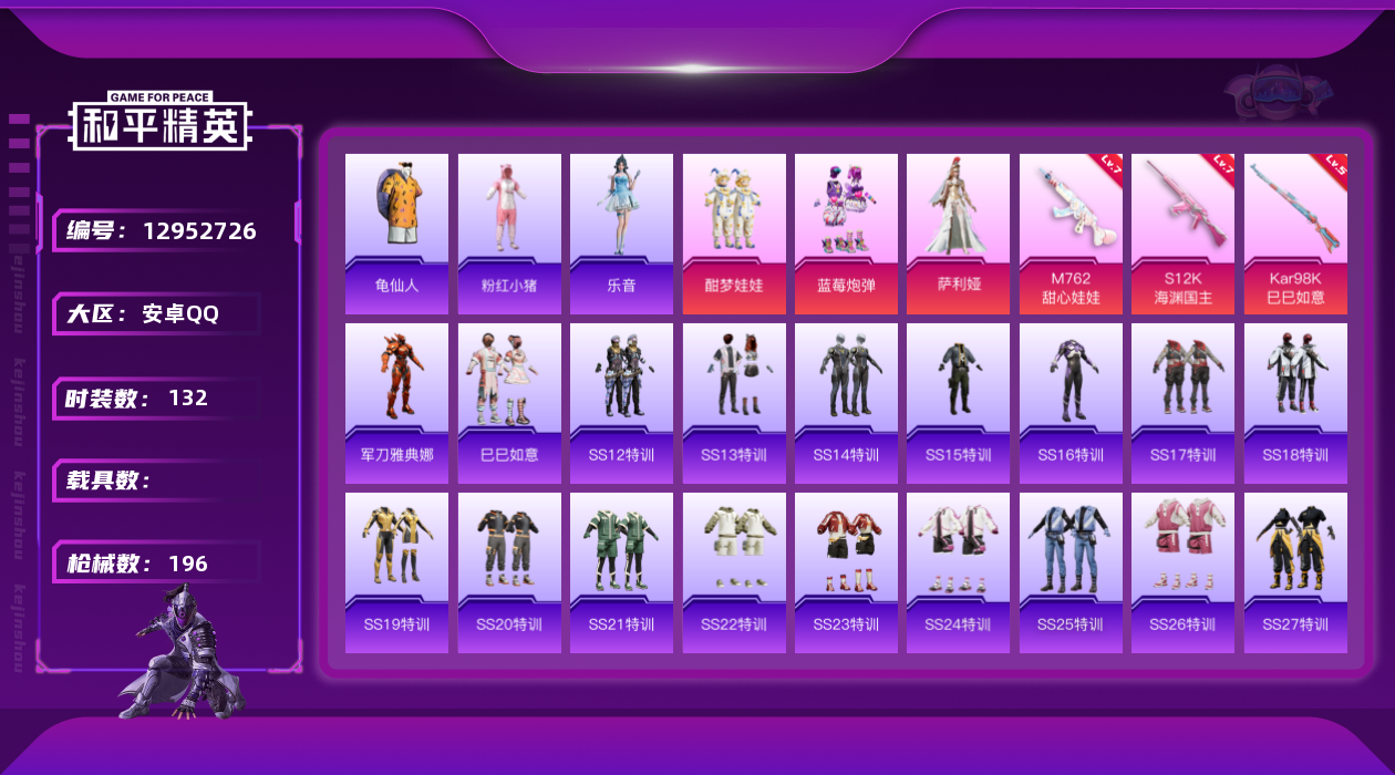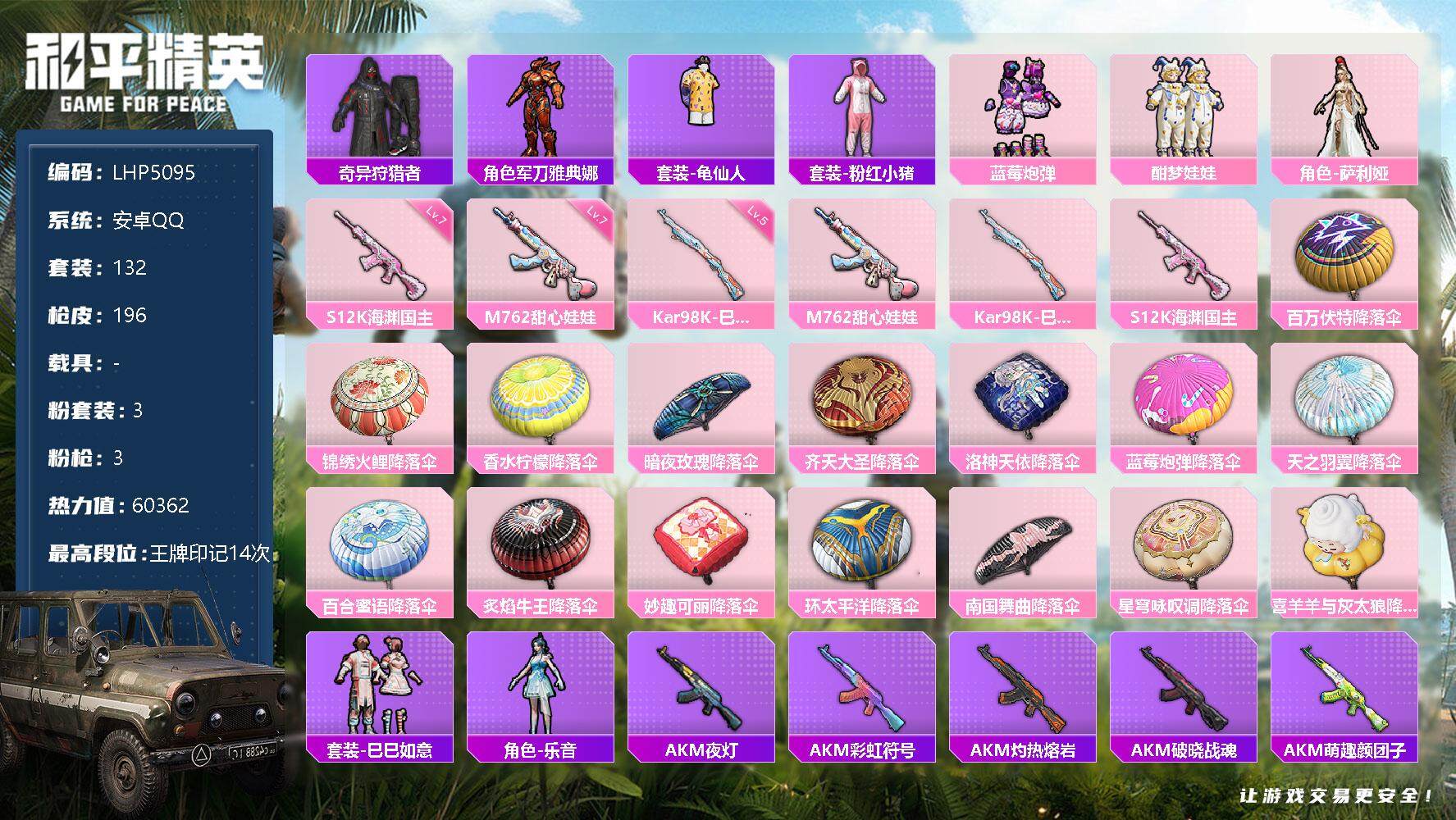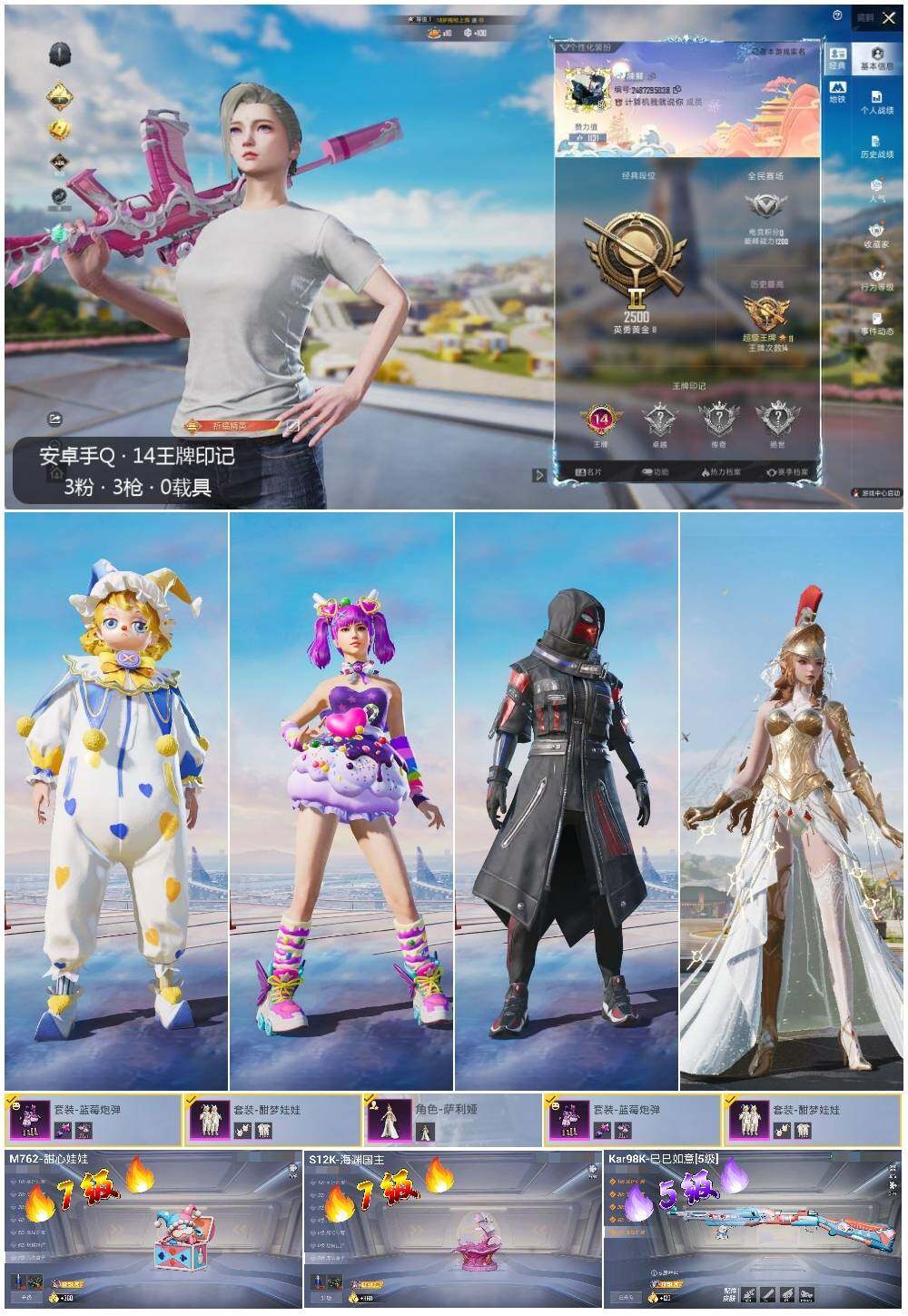 [12952726]【特价急出/详情看图】:安卓 手Q-3粉装-3特效枪-6w热力值-14王牌印记-132套装-196枪皮【热门品类】:套装-奇异狩猎者,角色-军刀雅典娜,套装-龟仙人,套装-粉红小猪【粉色套装】:粉装-蓝莓炮弹,粉装-酣梦娃娃,角色-萨利娅【粉色枪皮等级】:M762-甜心娃娃(七级),Kar98K-巳巳如意(五级),S12K-海渊国主(七级)