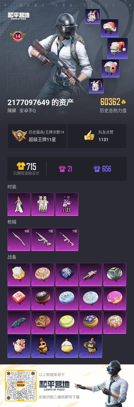 - PX_2094934- 安卓手Q-13王牌印记-11粉装-6特效枪-3载具-98447热力值-236套装-272枪皮-0卓越印记-0传奇印记 【11粉装】,梦幻火箭,2号机款机体服,荧海星豚,千金淑猫,虎啸骄阳,炙焰赤龙,飓风飞鹰,莲影清波,幻彩马卡龙,银刃赛罗,小蓝 【6特效枪】AKM-梦之光华-5级 SCAR-L-青春物语-4级 M416-五爪金龙-5级 M416-全功率超战-1级 Kar98