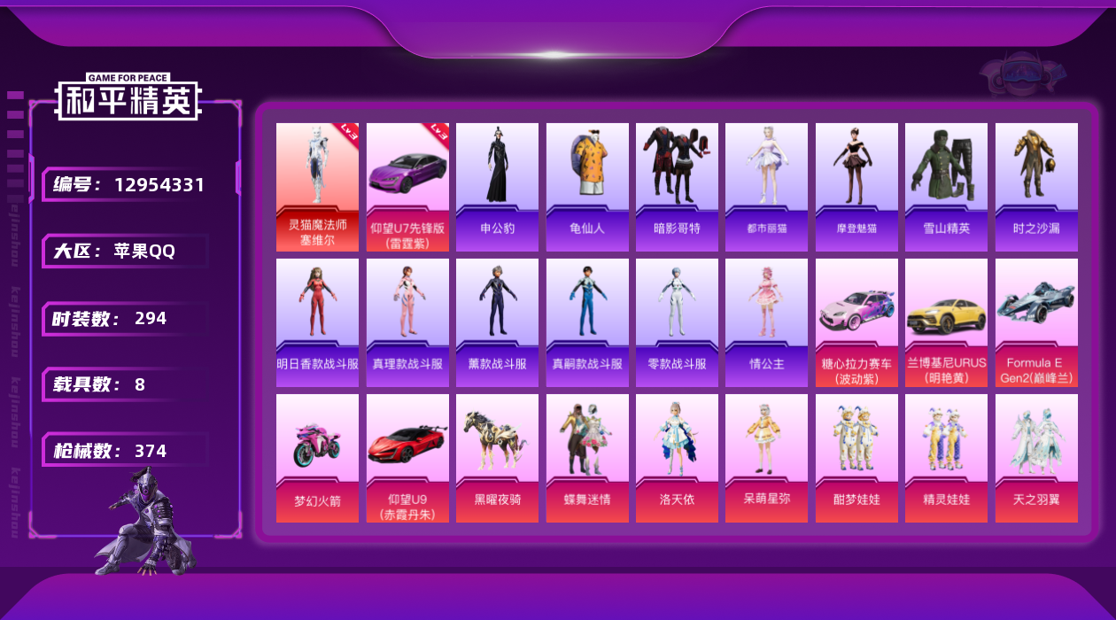 [12954331]素材身法号/老木乃伊/无敌战神框3/绝世印记3/地铁满天赋【特价急出/详情看图】:苹果 手Q-无敌战神框-1神装-32粉装-19特效枪-8载具-8粉色飞行器-14.9w热力值-19王牌印记-294套装-374枪皮【红色载具】:仰望U7(雷霆紫)(三级)【红色神装等级】:灵猫魔法师-塞维尔(三级)【热门品类】:粉装-梦幻火箭,套装-都市猎人,套装-冥河战士,套装-奇异狩猎者,角色-军刀雅典娜,套装-SS1特训,套装-龟仙人,套装-潮萌小黄鸭,套装-暗影哥特,套装-浪漫波比,小恶魔头饰,熔岩游骑兵面罩,M416-星际漫游,熔岩游骑兵连帽夹克【粉色载具】:兰博基尼URUS(明艳黄),仰望U9(赤霞丹朱),仰望U7(雷霆紫),Formula E Gen2(巅峰兰),糖心拉力赛车(波动紫),双人摩托-梦幻火箭,僚机-萌兔起飞,黑曜夜骑【粉色套装】:粉装-甜心巧克力,粉装-宝贝奶油派,粉装-天使彩虹糖,粉装-金曜白虎,粉装-蝶舞迷情,粉装-精灵迷巫,粉装-梦幻火箭,粉装-天启纪元,粉装-心之恋语,粉装-桀骜红莲,角色-洛天依,粉装-俏雪含霜,角色-零号机款机体服,角色-初号机款机体服,角色-2号机款机体服,粉装-甜心娃娃,粉装-精灵娃娃,粉装-酣梦娃娃,粉装-暗星紫秘,粉装-天之羽翼,粉装-橘柚倾心,角色-复仇流浪者,蜀山剑侠-李逍遥,超级赛亚人-孙悟空,粉装-飒粉甜心,角色-白勺歌姬,角色-呆萌星弥,粉装-炫光之旅,角色-烟云彩露,粉装-霓虹漫游,角色-千金淑猫,角色-奇迹舞步 美琪【粉色枪皮等级】:AKM-甜心宝贝(六级),SCAR-L-梦幻火箭(六级),M416-心之恋语(二级),M416-风花雪月(五级),M416-灵猫魔法师(三级),GROZA-焦糖拿铁(五级),AUG-超新星(五级),M762-甜心娃娃(四级),Vector-环太平洋(七级),P90-能量风暴(五级),Kar98K-绿意幻情(四级),Kar98K-巳巳如意(五级),M24-暗星紫秘(四级),AWM-橘柚倾心(四级),DP-28-千金淑猫(四级),DP-28-豹影疾电(五级),MG3-洛神天依(五级),MG3-梦幻舞会(二级),MG-36-沧焰双生(五级)【粉色飞行器】:春暖花开飞行器,梦幻火箭飞行器,心之恋语飞行翼,天之羽翼飞行器,霓虹漫游飞行器,灵猫魔法师飞行器,飞天猪飞行器