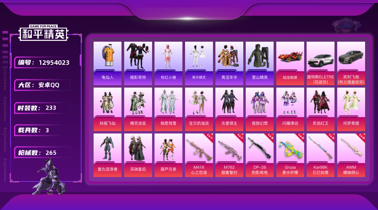 [12954023]素材身法号【特价急出/详情看图】:安卓 手Q-12粉装-8特效枪-3载具-4粉色飞行器-9.2w热力值-25王牌印记-233套装-265枪皮【热门品类】:套装-都市猎人,套装-沙漠守护者,套装-龟仙人,套装-暗影哥特,套装-粉红小猪,小恶魔头饰【粉色载具】:路特斯ELETRE(花绽灰),宾利飞驰(布罗德盖棕双色),焰龙咆哮【粉色套装】:粉装-深渊皇后,粉装-宝贝奶油派,粉装-精灵迷巫,粉装-古堡领主,粉装-极致幻想,粉装-扶摇飞仙,粉装-炙焰红王,粉装-相思残雪,粉装-葫芦兄弟,粉装-闪耀律动,角色-复仇流浪者,粉装-闲梦青缨【粉色枪皮等级】:M416-心之恋语(七级),GROZA-香水柠檬(五级),M762-甜蜜誓约(七级),Kar98K-巳巳如意(五级),AWM-橘柚倾心(二级),AMR-智耀战神(二级),DP-28-豹影疾电(五级)【粉色飞行器】:甜蜜誓约飞行器,星之彼岸飞行器,天之羽翼飞行器,幻梦音符飞行器