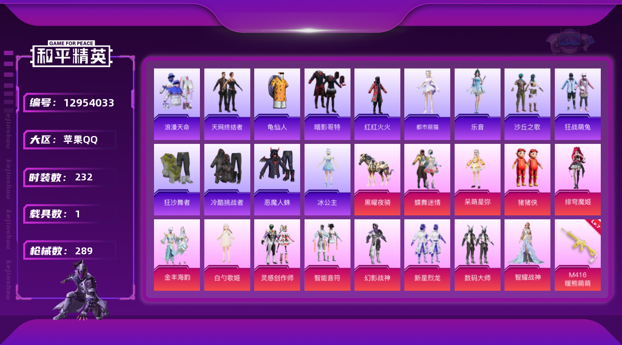 [12954033]素材身法号【特价急出/详情看图】:苹果 手Q-13粉装-8特效枪-1载具-3粉色飞行器-9w热力值-8王牌印记-232套装-289枪皮【热门品类】:粉装-梦幻火箭,套装-浪漫天命,套装-赤蝎幽灵,套装-都市猎人,套装-派对舞王,套装-深海小丑鱼,套装-胖达团团,套装-胖达圆圆,套装-天网终结者,套装-忍者信条,套装-龟仙人,套装-暗影哥特,套装-红红火火,M416-星际漫游【粉色载具】:黑曜夜骑【粉色套装】:粉装-幻影战神,粉装-数码大师,粉装-蝶舞迷情,粉装-梦幻火箭,粉装-智能音符,粉装-新星烈龙,粉装-灵感创作师,角色-白勺歌姬,角色-呆萌星弥,玩偶服-猪猪侠,粉装-金丰海韵,角色-智耀战神,角色-绯穹魔姬【粉色枪皮等级】:AKM-绿萝繁花(五级),M416-五爪金龙(六级),M416-暖熊萌萌(七级),M416-电玩时刻(五级),GROZA-旋转彩虹(六级),Kar98K-巳巳如意(五级),Mk14-精灵梦叶罗丽(五级),DP-28-豹影疾电(五级)【粉色飞行器】:春暖花开飞行器,梦幻火箭飞行器,灵猫魔法师飞行器