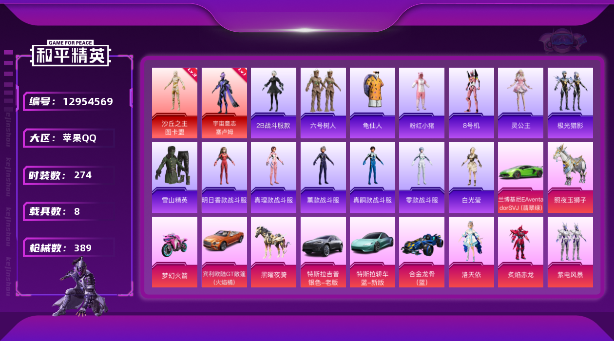 - PX_2077582- 苹果手Q-1王牌印记-2粉装-6特效枪-0载具-50632热力值-121套装-165枪皮-0卓越印记-0传奇印记 【2粉装】,圣堂之誓,海螺星光 【6特效枪】AKM-炫紫旋律-5级 SCAR-L-纯梦嫁纱-5级 M416-五爪金龙-7级 Kar98K-巳巳如意-5级 Mk14-闲梦青缨-5级 DP-28-暗夜鎏金-4级 【2稀有紫装】,龟仙人,怀庆长公主, 【121稀有时