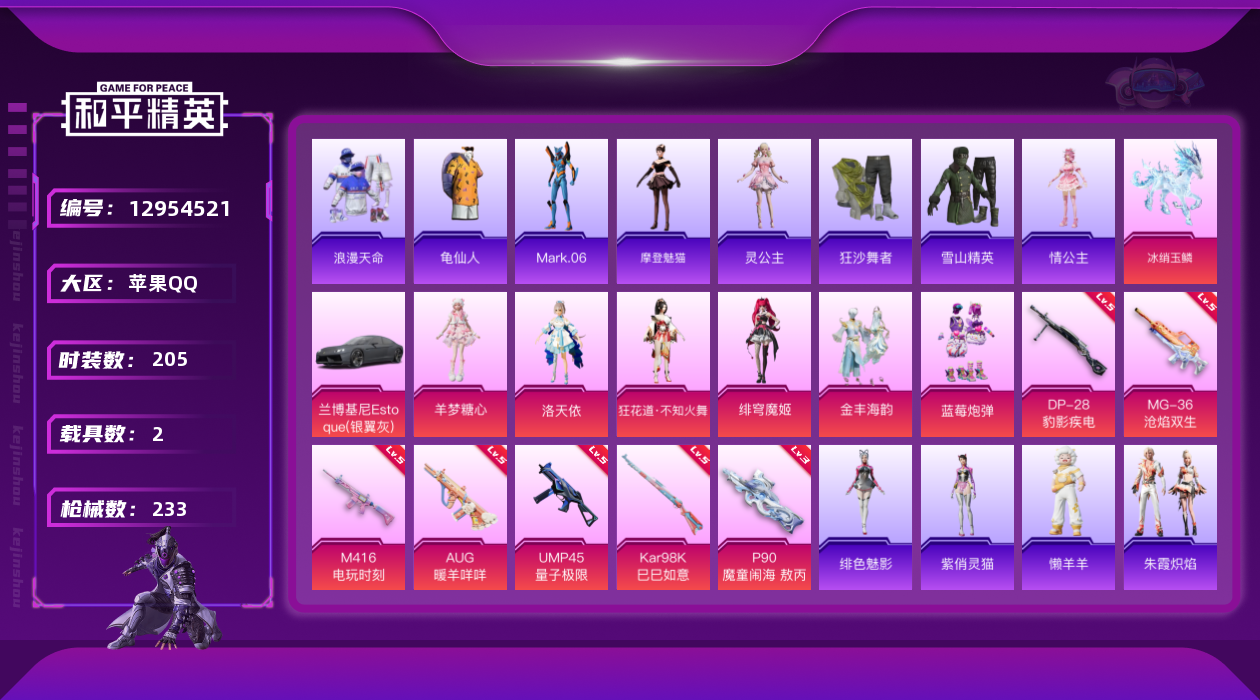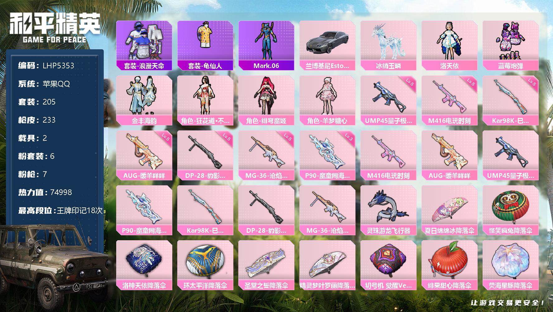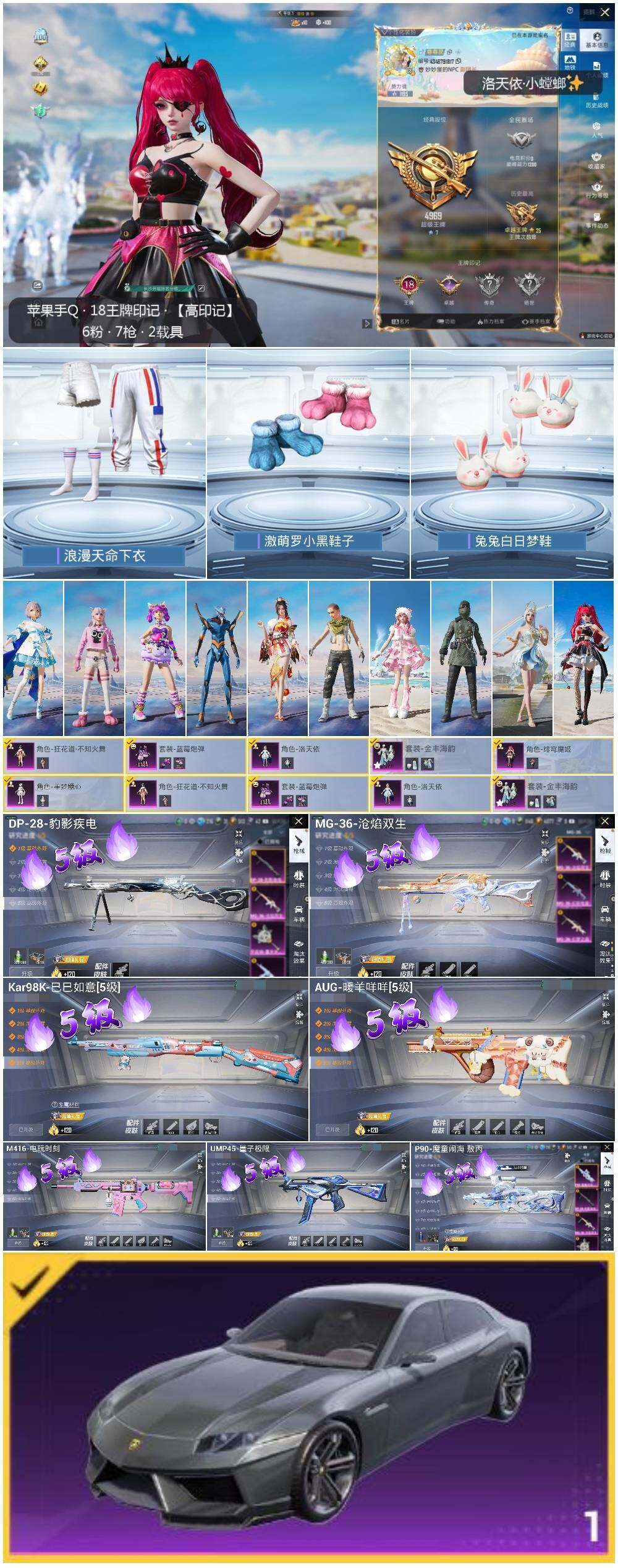 [12954521]素材身法号【特价急出/详情看图】:苹果 手Q-6粉装-7特效枪-2载具-1粉色飞行器-7.4w热力值-18王牌印记-205套装-233枪皮【热门品类】:套装-浪漫天命,套装-龟仙人,角色-Mark.06【粉色载具】:兰博基尼Estoque(银翼灰),冰绡玉鳞【粉色套装】:角色-洛天依,粉装-蓝莓炮弹,粉装-金丰海韵,角色-狂花道·不知火舞,角色-绯穹魔姬,角色-羊梦糖心【粉色枪皮等级】:M416-电玩时刻(五级),AUG-暖羊咩咩(五级),UMP45-量子极限(五级),P90-魔童闹海 敖丙(三级),Kar98K-巳巳如意(五级),DP-28-豹影疾电(五级),MG-36-沧焰双生(五级)【粉色飞行器】:灵珠游龙飞行器