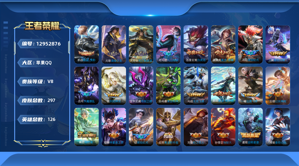 [12952876]【特价急出/详情看图】:苹果Q-V8-至尊星耀IV段位-125英雄-295皮肤-1典藏-23传说-68史诗 【荣耀典藏】:李白鸣剑曳影 【传说皮肤】:干将莫邪千山共赴,元歌诡秘之主,大司命死亡执政官,司马懿九山相柳,云缨幻光神枪,桑启鸣野蒿,赵云乘龙铭钟鼎,马超琥珀纪元,铠琥珀纪元,澜逐花归海,马超无双飞将,裴擒虎寅虎赤拳,周瑜音你心动,镜炽阳神光,虞姬启明星使,曜云鹰飞将,刘备时之恋人,百里玄策白虎志,后羿黄金射手座,貂蝉仲夏夜之梦,孙尚香末日机甲,孙悟空地狱火,吕布天魔缭乱 【限定皮肤】:姜子牙天穹之誓,狄仁杰阴阳师,赵云皇家上将,嬴政优雅恋人,鲁班七号狮舞东方,庄周高山流水,芈月重明,吕布天魔缭乱,周瑜赤莲之焰,夏侯惇朔风刀,曹操烛龙,曹操天狼征服者,典韦穷奇,典韦蓝屏警告,马可波罗暗影游猎,狄仁杰魔术师,狄仁杰万华元夜,达摩沙漠行僧,项羽海滩派对,老夫子醍醐杖,程咬金演武夺筹,韩信逐梦之影,韩信飞衡,兰陵王驯魔猎人,兰陵王金庭之子,牛魔御旌,李元芳银河之约,虞姬启明星使,钟馗神迹守卫,钟馗驱傩正仪,女娲朔望之晖,雅典娜单词大作战,太乙真人饕餮,鬼谷子原初探秘者,苏烈千军破阵,百里玄策白虎志,百里玄策原初追逐者,弈星混沌棋,沈梦溪星空之诺,沈梦溪大漠名商,明世隐疑决卦,裴擒虎李小龙,裴擒虎寅虎赤拳,狂铁御狮,米莱狄御霄,云中君纤云弄巧,盾山御銮,猪八戒西部大镖客,上官婉儿梁祝,嫦娥如梦令,蒙犽狂想玩偶喵,高渐离燃音魔法,妲己灵卜魔法,鬼谷子天穹祈灯,伽罗琥珀纪元,铠琥珀纪元,马超琥珀纪元,大乔乘龙忆丹青,赵云乘龙铭钟鼎,百里玄策超元猎域,沈梦溪龙舞盛年,鲁班七号蔬乡物语,李元芳蔬乡物语,刘邦剑破天穹,程咬金群星魔术团,周瑜熔金海岸 【年限皮肤】:百里玄策白虎志,裴擒虎寅虎赤拳,韩信飞衡,大乔乘龙忆丹青,赵云乘龙铭钟鼎 【赛季限定】:芈月重明,夏侯惇朔风刀,曹操烛龙,典韦穷奇,狄仁杰万华元夜,达摩沙漠行僧,老夫子醍醐杖,程咬金演武夺筹,兰陵王金庭之子,牛魔御旌,钟馗驱傩正仪,太乙真人饕餮,鬼谷子原初探秘者,苏烈千军破阵,百里玄策原初追逐者,弈星混沌棋,沈梦溪大漠名商,明世隐疑决卦,狂铁御狮,米莱狄御霄,盾山御銮,鬼谷子天穹祈灯,刘邦剑破天穹,姜子牙天穹之誓 【战令限定】:鲁班七号狮舞东方,周瑜赤莲之焰,典韦蓝屏警告,马可波罗暗影游猎,兰陵王驯魔猎人,李元芳银河