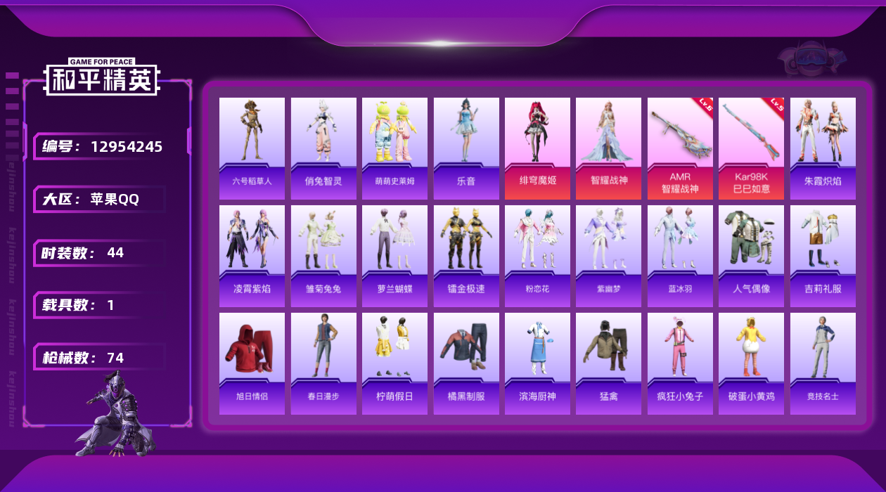 - [11516194]1红装 9粉装 16特效枪 3载具 9印记 可二次 可修改实名 连体王者 身法装备:都市猎人,暗影哥特(红眼罩),萌熊伴侣背包(粉熊背包) 优质装备:辉羽雀灵-初翊,二级辉羽雀灵-初翊,辉羽雀灵自行车,虚妄之影(炫耀紫),最终圣卫者摩托车,都市猎人,萌熊伴侣背包(粉熊背包),蝶舞迷情,未来战士,AUG星之彼岸,AKM梦之光华,M416风花雪月,洛天依,UMP45启明星,P90粉樱探戈,MG3酷泡奶龙,SCAR-L-锦绣绵绵,七级AUG-星之彼岸,MK14-甜梦熊击,MG3-辉羽雀灵,烟雾弹-甜梦果泡,幻彩电音,Vector-最终圣卫者,P90-冷漠罗丽,汤姆逊-热量炸弹,破片手榴弹-美味星星糖,M416-灵猫魔法师,Kar98K-巳巳如意 热门装扮:飓风飞鹰,千面幻镜,启明星,歌者泠鸢,未来歌姬,暗夜行者,动感兔斯基,鹰眼刺客,梦魇先生,深海小丑鱼,东方飞龙,都市猎人 五级特效枪:五级Kar98K-巳巳如意,五级P90-冷漠罗丽,五级汤姆逊-热量炸弹,五级破片手榴弹-美味星星糖,五级MK14-甜梦熊击,五级SCAR-L-锦绣绵绵 四级特效枪:四级烟雾弹-甜梦果泡,四级UMP45-启明星,四级MG3-酷泡奶龙,四级AKM-梦之光华 三级特效枪:三级Vector-最终圣卫者,三级M416-灵猫魔法师,三级MG3-辉羽雀灵 一级特效枪:一级P90-粉樱探戈,一级M416-风花雪月 紫色装扮:田园牧歌,轻风白浪,和煦暖阳,SS22特训,白啸长虹,SS23特训,幻彩翩翩,妙红点点,白兰地假日,苍岚星,娇憨猪猪,萌趣咩咩,SS21特训,熠彩粉晶,紫芒星,SS31特训套装,虚空漩涡,冰川特警,冷焰舞者,云朵鹅,彩虹兔,雪绒豹,SS33特训套装,青涩时光,顶瓜瓜,诡诞巡游,混沌火种,SS20特训,暗夜傀儡,微雨春柳,猎梦纪元,粉团憨憨,豚鼠丹丹,软羊咩咩,甜心亚梦,虚音幻奏,瑞龙福将,团圆交子,SS17特训,都市漫游者,酷潮明星,长空猛禽,雪鹰学院,霓虹街区,青年教官,荷畔雨呱,缤纷果语,耀眼新星,蓝彩潮人,蓝色守护者,虎虎生威吉莉,蜜露汐语,飞行日记,魅力单车,鹤鸣,麻辣教官,龙的传人,龟仙人,海岛探路者,夏日倾情,完美偶像,帅气教官,幻世战舞者,探宝勇士,空岛之星,牛气冲天,牛气满满,猛禽,异域银装,玉兔迎春,竞技名士,暗影哥特(红眼罩),惊鸿侠骨,SS24特