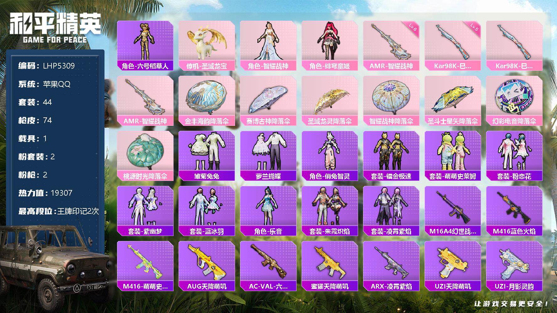 - PX_2107197- 苹果手Q-15王牌印记-有战神框-7粉装-6特效枪-1载具-73148热力值-150套装-224枪皮-2卓越印记-2传奇印记 【7粉装】,甜心巧克力,宝贝奶油派,天使彩虹糖,守护天翼,垂柳戏鸭,音爆索尼克,蝶舞蔷薇 【6特效枪】AKM-甜心宝贝-7级 M416-灵猫魔法师-3级 AUG-暖羊咩咩-5级 M762-甜蜜誓约-7级 Kar98K-巳巳如意-5级 烟雾弹-电雾迷城