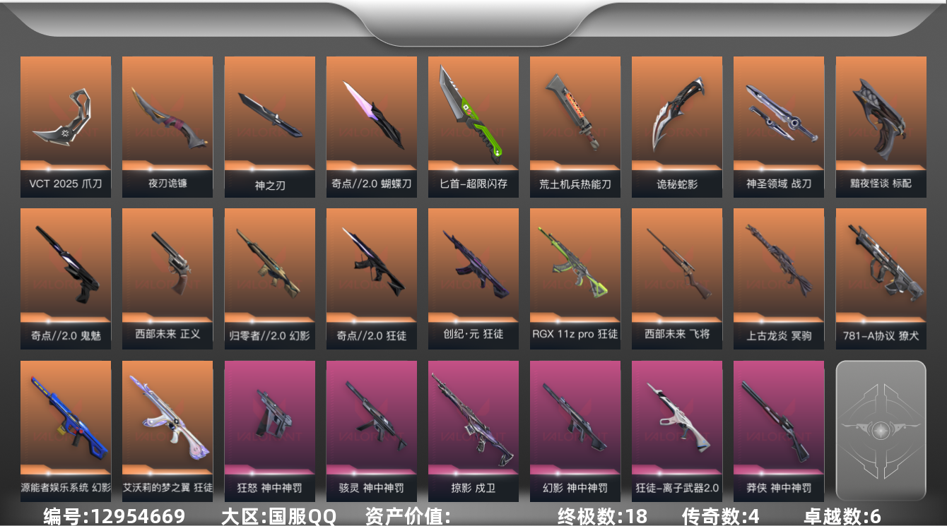 [12954669]皮肤资产价值45420【套装】:VCT 2025 赛季套装,奇点//2.0套装,神中神罚套装 【英雄】:幻棱,炼狱,维斯,暮蝶,钛狐,壹决,铁臂,捷风,雷兹,幽影,不死鸟,贤者,猎枭,蝰蛇,零,芮娜,奇乐,尚勃勒,霓虹,斯凯,夜露,星礈,K/O,海神,盖可,黑梦,钢锁 【近战 武器】:近战武器-神之刃,近战武器-奇点//2.0 蝴蝶刀,近战武器-VCT 2025 爪刀,近战武器-超限闪存 匕首,近战武器-荒土机兵 热能刀,近战武器-夜刃诡镰,近战武器-诡秘蛇影 军刀,近战武器-神圣领域 战刀 【狂徒】:狂徒-艾沃莉的梦之翼,狂徒-2025全球冠军赛,狂徒-奇点//2.0,狂徒-创·纪元,狂徒-RGX 11z Pro,狂徒-离子武器//2.0,狂徒-荒土机兵,狂徒-诡秘蛇影 【幻影】:幻影-源能者娱乐系统,幻影-归零者//2.0,幻影-混沌序曲//2.0,幻影-神中神罚,幻影-超限闪存,幻影-神圣领域,幻影-纳米打击,幻影-末日之翼 【戍卫】:戍卫-掠影,戍卫-浮光跃金,戍卫-逆冲蛮牛,戍卫-月球哨兵,戍卫-折光棱晶 【獠犬】:獠犬-781-A协议,獠犬-神圣领域,獠犬-模拟赫兹,獠犬-逆冲蛮牛 【冥驹】:冥驹-上古龙炎,冥驹-荒土机兵,冥驹-模拟赫兹,冥驹-星云暗涌 【飞将】:飞将-西部未来,飞将-末日之翼 【莽侠】:莽侠-神中神罚,莽侠-超限闪存,莽侠-诡秘蛇影,莽侠-月球哨兵 【战神】:战神-神圣领域,战神-浮光跃金 【奥丁】:奥丁-纳米打击,奥丁-末日之翼 【判官】:判官-诡秘蛇影,判官-纳米打击x 【雄鹿】:雄鹿-模拟赫兹,雄鹿-逆冲蛮牛,雄鹿-月球哨兵 【骇灵】:骇灵-神中神罚,骇灵-荒土机兵,骇灵-无限竞技,骇灵-浮光跃金,骇灵-星云暗涌 【蜂刺】:蜂刺-超限闪存,蜂刺-星云暗涌,蜂刺-折光棱晶 【标配】:标配-黯夜怪谈,标配-荒土机兵,标配-浮光跃金,标配-折光棱晶 【正义】:正义-西部未来,正义-超限闪存,正义-纳米打击,正义-月球哨兵 【鬼魅】:鬼魅-奇点//2.0,鬼魅-诡秘蛇影,鬼魅-模拟赫兹,鬼魅-星云暗涌 【狂怒】:狂怒-神中神罚,狂怒-神圣领域,狂怒-逆冲蛮牛 【短炮】:短炮-末日之翼 【卡面】:终章:激斗汉堡 卡面,进入射程 卡面,分崩离析 卡面,纳米打击 卡面,抑制技术 卡面,激斗汉堡 卡面,瓦娃脸雪糕 P2 卡面,从黄昏到黎明 卡