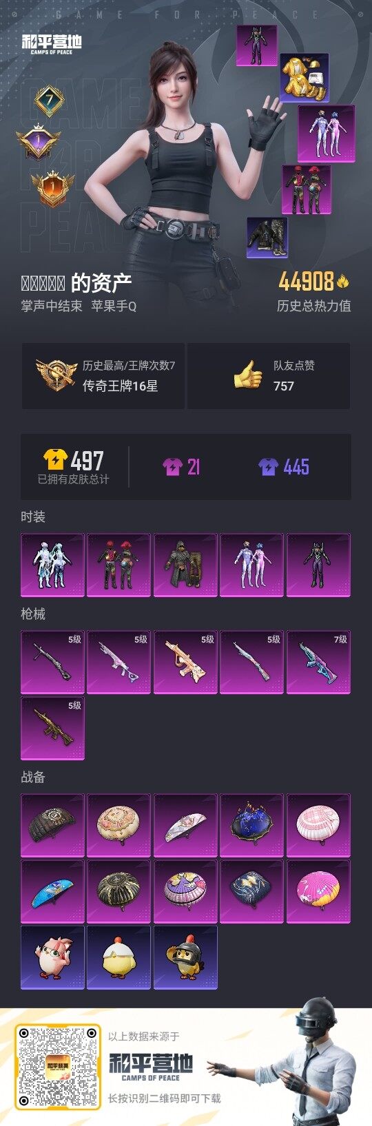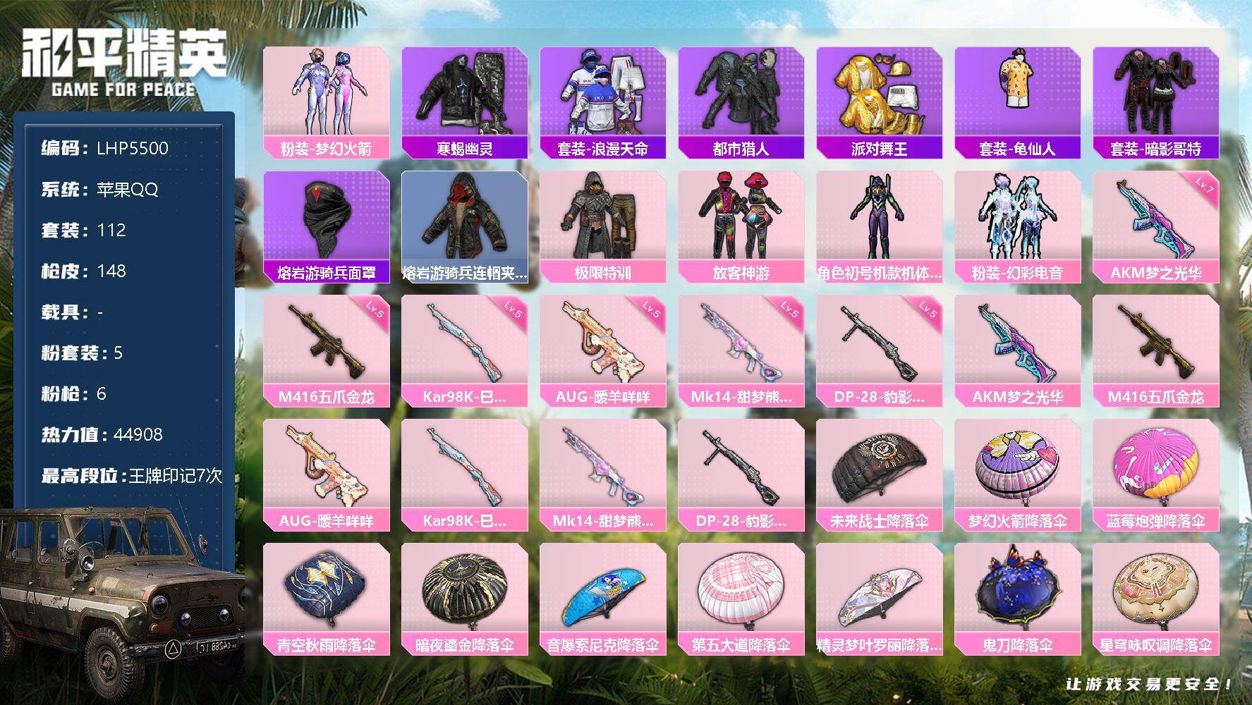 [12955768]素材身法号/地铁满天赋 苹果 手Q-5粉装-6特效枪-4.4w热力值-7王牌印记-112套装-148枪皮【热门品类】:粉装-梦幻火箭,套装-寒蝎幽灵,套装-浪漫天命,套装-都市猎人,套装-派对舞王,套装-龟仙人,套装-暗影哥特,熔岩游骑兵面罩,熔岩游骑兵连帽夹克【粉色套装】:粉装-极限特训,粉装-梦幻火箭,粉装-放客神游,角色-初号机款机体服,粉装-幻彩电音【粉色枪皮等级】:AKM-梦之光华(七级),M416-五爪金龙(五级),AUG-暖羊咩咩(五级),Kar98K-巳巳如意(五级),Mk14-甜梦熊击(五级),DP-28-豹影疾电(五级)