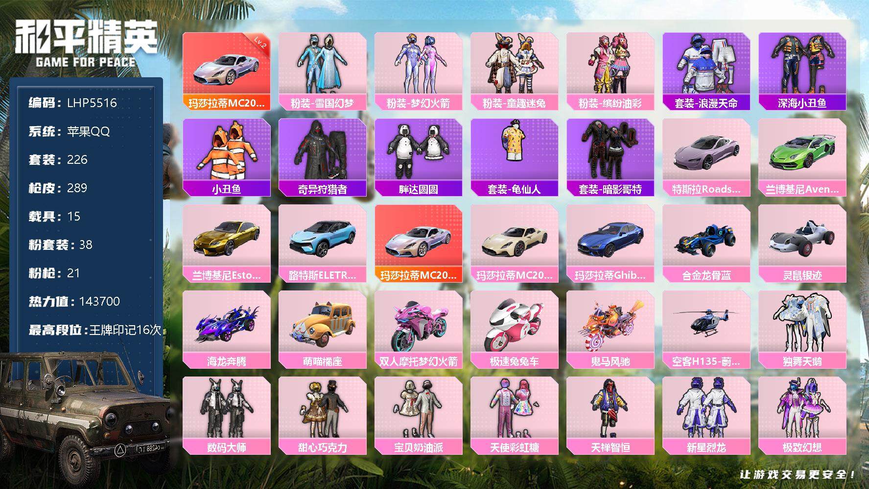 [12955878]素材身法号/M416-至情至圣(九级) 苹果 手Q-38粉装-21特效枪-15载具-6粉色飞行器-14.3w热力值-16王牌印记-226套装-289枪皮【红色载具】:玛莎拉蒂MC20(幻星粉)(二级)【热门品类】:粉装-雪国幻梦,粉装-梦幻火箭,粉装-童趣迷兔,粉装-缤纷油彩,套装-浪漫天命,套装-深海小丑鱼,套装-小丑鱼,套装-奇异狩猎者,套装-胖达圆圆,套装-龟仙人,套装-暗影哥特【粉色载具】:特斯拉Roadster(沁心粉),兰博基尼Aventador SVJ(翡翠绿),兰博基尼Estoque(炫光金),路特斯ELETRE(冰川蓝),玛莎拉蒂MC20(幻星粉),玛莎拉蒂MC20(星石白),玛莎拉蒂Ghibli(蓝),合金龙骨(蓝),灵鼠银迹,海龙奔腾,萌喵橘座,双人摩托-梦幻火箭,极速兔兔车,鬼马风驰,空客H135-蔚蓝之翼【粉色套装】:粉装-独舞天鹅,粉装-数码大师,粉装-甜心巧克力,粉装-宝贝奶油派,粉装-天使彩虹糖,粉装-雪国幻梦,粉装-梦幻火箭,粉装-缤纷油彩,粉装-天禅智恒,粉装-新星烈龙,粉装-极致幻想,粉装-草莓生巧,粉装-冰霜白皇,粉装-童趣迷兔,粉装-炙焰红王,粉装-香水柠檬,粉装-甜梦冰蝶,粉装-馨动时刻,角色-洛天依,粉装-海渊国主,粉装-蓝莓炮弹,粉装-流星咚咚,粉装-精灵娃娃,粉装-酣梦娃娃,粉装-恐龙拽拽,粉装-橘柚倾心,粉装-筑梦精灵,粉装-荒漠赏金,粉装-绒雪飘舞,粉装-傲雪凌霜,粉装-霁雪冰心,粉装-垂柳戏鸭,粉装-霓裳武神,粉装-太空嘟嘟,粉装-冰川幽秘,粉装-闲梦青缨,角色-荧海星豚【粉色枪皮等级】:AKM-炫紫旋律(五级),M16A4-垂柳戏鸭(二级),SCAR-L-童趣迷兔(七级),M416-五爪金龙(一级),M416-心之恋语(一级),M416-至情至圣(九级),GROZA-香水柠檬(七级),M762-甜心娃娃(四级),UZI-筑梦精灵(四级),UMP45-雪国精灵(七级),UMP45-恐龙拽拽(一级),Vector-红伞翩翩(四级),野牛-流星咚咚(一级),野牛-青空秋雨(三级),Kar98K-巳巳如意(二级),AWM-橘柚倾心(一级),S12K-海渊国主(四级),M249-蓝莓炮弹(一级),M249-绒雪飘舞(六级),DP-28-扶摇飞仙(一级),MG3-洛神天依(五级)【粉色飞行器】:精灵迷巫飞行器,潮汐统领