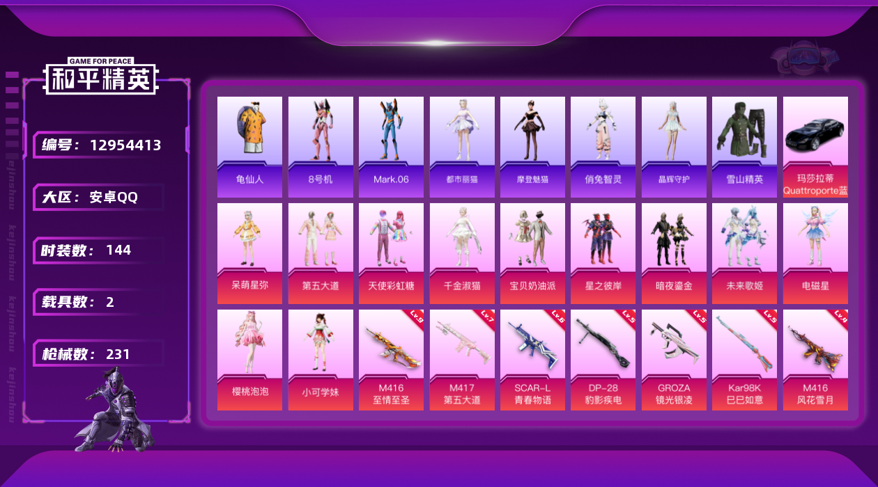 [12954413]连体王者v8-265皮肤-22传说-4珍品-2典藏 / 素材身法号/地铁满天赋/M416-至情至圣(九级)【特价急出/详情看图】:安卓 手Q-12粉装-10特效枪-2载具-6粉色飞行器-7.5w热力值-12王牌印记-144套装-231枪皮【热门品类】:粉装-梦幻火箭,套装-都市猎人,角色-军刀雅典娜,套装-龟仙人,角色-8号机,角色-Mark.06,小恶魔头饰【粉色载具】:玛莎拉蒂Quattroporte(夜幕蓝),僚机-圣域龙宝【粉色套装】:粉装-宝贝奶油派,粉装-天使彩虹糖,粉装-梦幻火箭,粉装-星之彼岸,粉装-暗夜鎏金,粉装-第五大道,角色-呆萌星弥,角色-小可学妹,粉装-未来歌姬,角色-电磁星,角色-千金淑猫,角色-樱桃泡泡【粉色枪皮等级】:SCAR-L-青春物语(六级),M416-五爪金龙(一级),M416-风花雪月(四级),M416-至情至圣(九级),GROZA-镜光银凌(五级),Kar98K-巳巳如意(五级),Kar98K-圣域龙灵(三级),M417-第五大道(七级),DP-28-豹影疾电(五级)【粉色飞行器】:梦幻火箭飞行器,闪光银龙飞行器,黄族统领飞行器,镜域双华-灵镜之阶,幽焰列车飞行器,圣域金龙飞行器