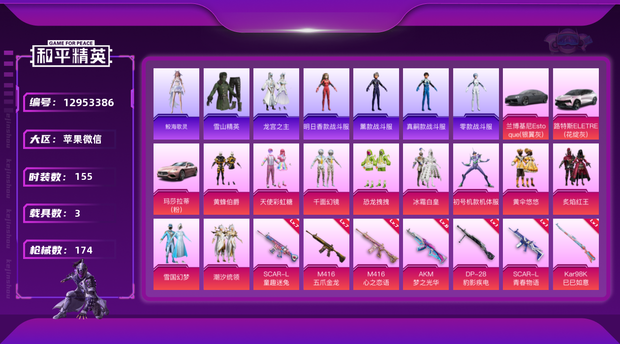 [12953386]素材身法号/无敌战神框1【特价急出/详情看图】:苹果 微信-无敌战神框-11粉装-7特效枪-3载具-3粉色飞行器-6.7w热力值-14王牌印记-155套装-174枪皮【热门品类】:粉装-雪国幻梦,粉装-梦幻火箭,套装-胖达圆圆,套装-浪客战士【粉色载具】:兰博基尼Estoque(银翼灰),路特斯ELETRE(花绽灰),玛莎拉蒂Ghibli(粉)【粉色套装】:粉装-天使彩虹糖,粉装-雪国幻梦,粉装-梦幻火箭,粉装-潮汐统领,粉装-黄蜂伯爵,粉装-冰霜白皇,粉装-炙焰红王,粉装-黄伞悠悠,角色-初号机款机体服,粉装-恐龙拽拽,粉装-千面幻镜【粉色枪皮等级】:AKM-梦之光华(六级),SCAR-L-童趣迷兔(七级),SCAR-L-青春物语(一级),M416-五爪金龙(七级),M416-心之恋语(七级),Kar98K-巳巳如意(一级),DP-28-豹影疾电(一级)【粉色飞行器】:梦幻火箭飞行器,庄周梦蝶飞行器,千面幻镜飞行器