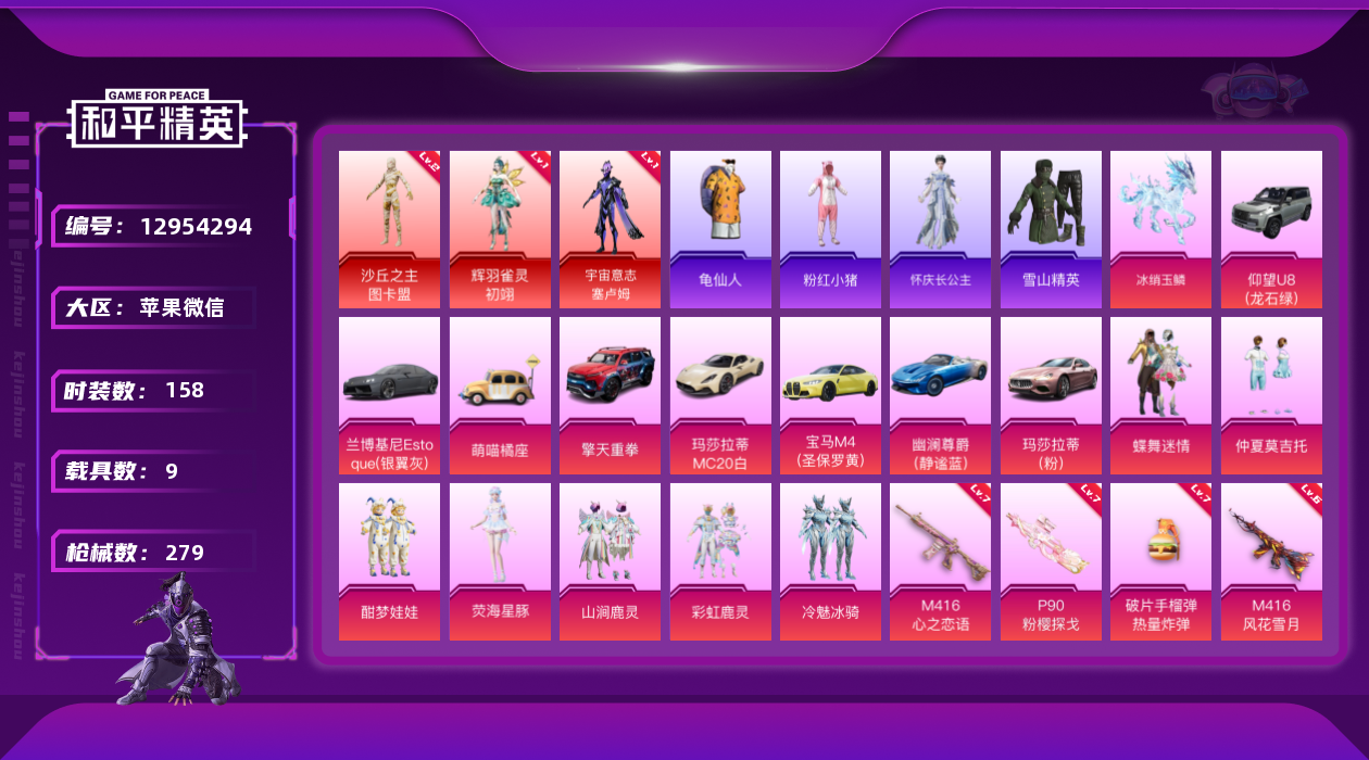 - [12388182]【特价急出/详情看图】:苹果 手Q-3神装-6粉装-15特效枪-1载具-9粉色飞行器-58302热力值-4王牌印记-94套装-165枪皮 【红色神装等级】:最终圣卫者-帕修斯(一级),圣域龙灵-瑞拉(三级),盛世惊鸿-云鸾(一级) 【红色角色神装】:最终圣卫者-帕修斯,圣域龙灵-瑞拉,盛世惊鸿-云鸾 【热门品类】:粉装-梦幻火箭,套装-AG战队服,角色-Mark.06 【粉色载具】:冰绡玉鳞 【粉色套装】:粉装-梦幻火箭,角色-星梦奇缘,粉装-金丰海韵,角色-千金淑猫,粉装-幻彩电音,角色-狂魅哈莉 【粉色枪皮等级】:SCAR-L-梦幻火箭(四级),M416-灵猫魔法师(三级),GROZA-精灵之光(三级),AUG-圣斗士星矢(五级),Famas-初号机 觉醒Ver.(五级),Vector-最终圣卫者(三级),AKS-74U-星穹咏叹调(一级),Kar98K-巳巳如意(五级),Kar98K-圣域龙灵(三级),Mk14-盛世惊鸿(三级),Mk14-爆裂游戏(一级),DP-28-豹影疾电(五级),镰刀-幽影之判(七级),烟雾弹-甜梦果泡(三级),破片手榴弹-瓶中星球(六级) 【粉色枪皮】:SCAR-L-梦幻火箭,M416-灵猫魔法师,GROZA-精灵之光,AUG-圣斗士星矢,Famas-初号机 觉醒Ver.,Vector-最终圣卫者,AKS-74U-星穹咏叹调,Kar98K-巳巳如意,Kar98K-圣域龙灵,Mk14-盛世惊鸿,Mk14-爆裂游戏,DP-28-豹影疾电,镰刀-幽影之判,烟雾弹-甜梦果泡,破片手榴弹-瓶中星球 【粉色飞行器】:酣梦熊熊飞行器,深渊漩涡飞行器,幽焰列车飞行器,动力核心飞行器,凤舞九天飞行器,圣域金龙飞行器,终晖之翼飞行器,灵猫魔法师飞行器,飞天猪飞行器 【粉色降落伞】:梦幻火箭降落伞,圣堂之誓降落伞,精灵梦叶罗丽降落伞,星梦奇缘降落伞,拳皇·狂花道降落伞,幽焰骑士降落伞,千金淑猫降落伞,临安公主降落伞,盛世惊鸿降落伞,圣域龙灵降落伞,星穹咏叹调降落伞,幻彩电音降落伞,双重狂想降落伞,最终圣卫者降落伞,冷漠罗丽降落伞,灵猫魔法师降落伞,绯穹魔姬降落伞,异瞳寒姬降落伞 【稀有套装】:套装-绒宝小鹅,套装-巳巳如意,套装-乐游熊熊,套装-雏菊兔兔,套装-萝兰蝴蝶,角色-狂花道·雅典娜,套装-糖糖葫芦,套装-青团波波,角色-都市丽猫,角色-许七安,