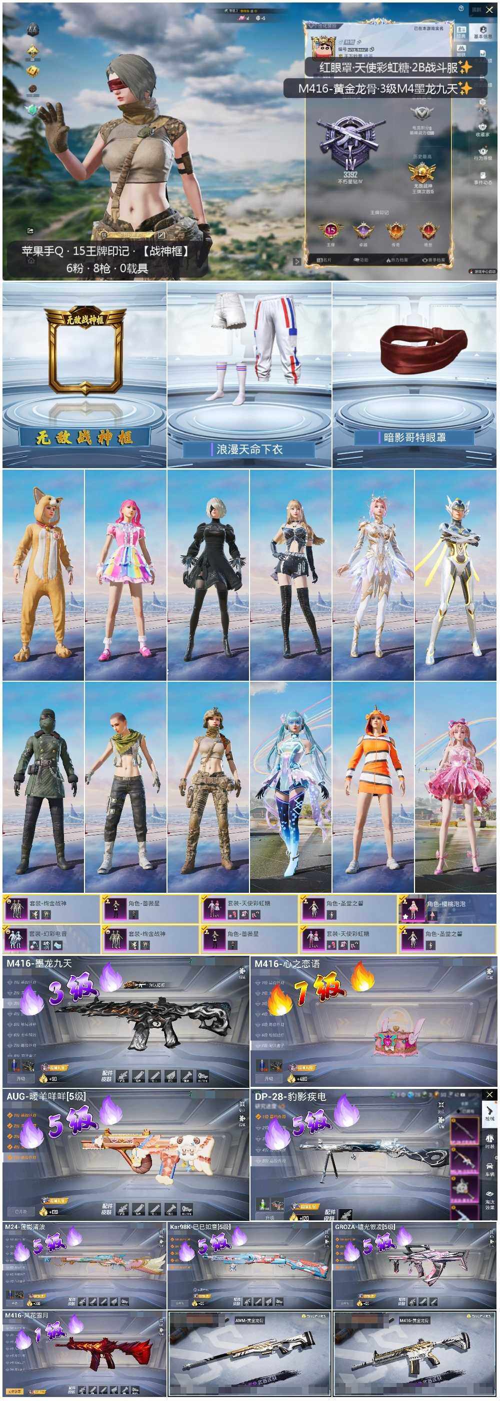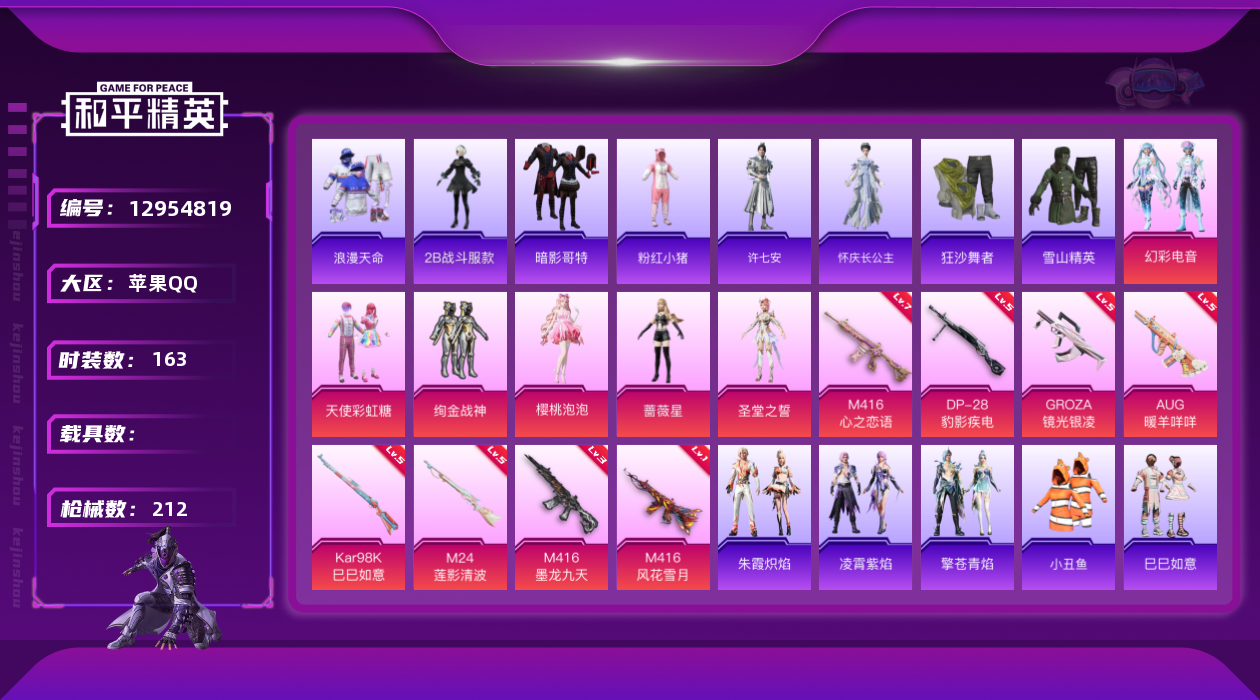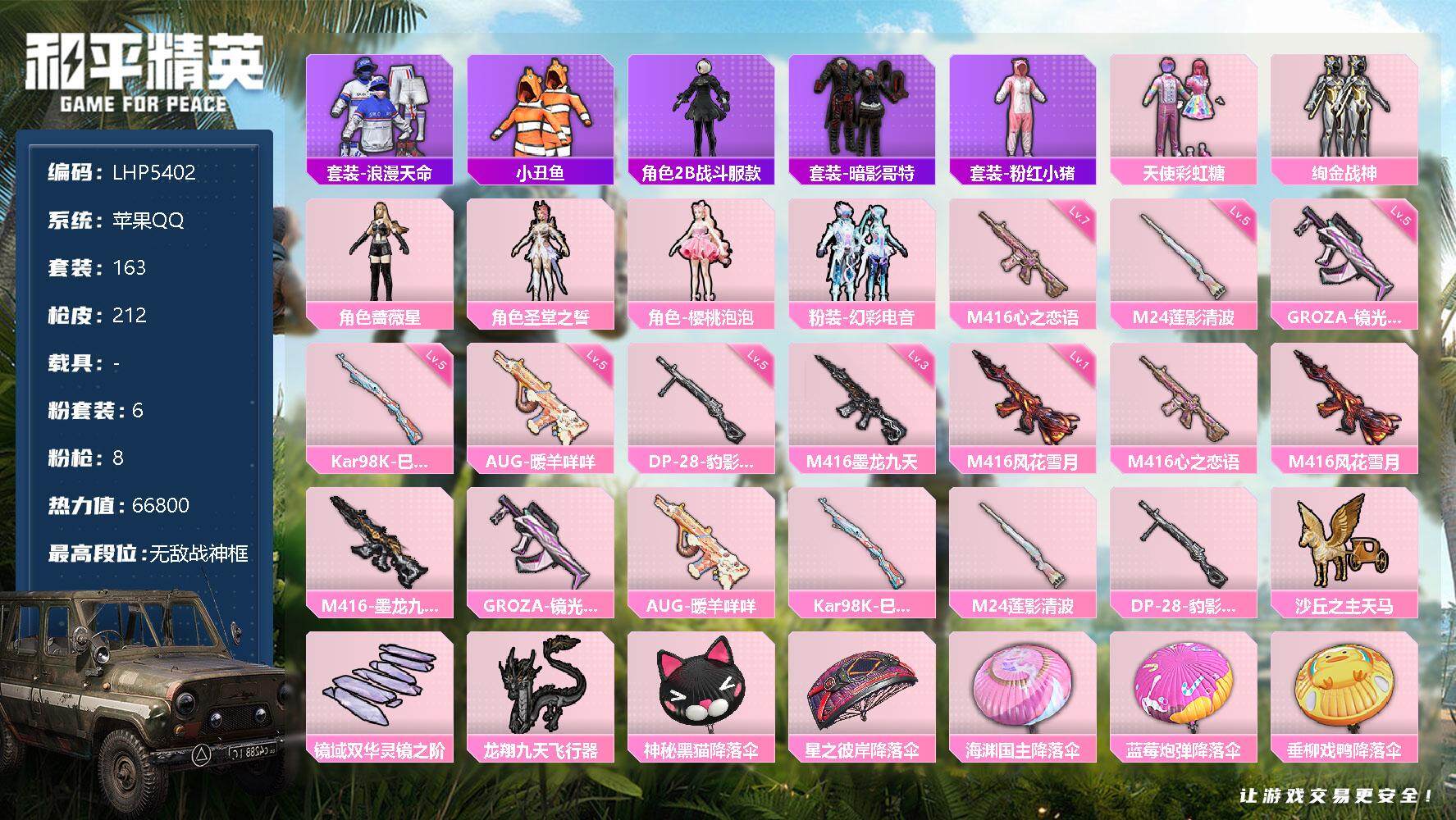 [12954819]素材身法号/绝世印记1/无敌战神框2【特价急出/详情看图】:苹果 手Q-无敌战神框-6粉装-8特效枪-3粉色飞行器-6.6w热力值-15王牌印记-163套装-212枪皮【热门品类】:套装-浪漫天命,套装-小丑鱼,角色-2B战斗服款,套装-暗影哥特,套装-粉红小猪【粉色套装】:粉装-天使彩虹糖,粉装-绚金战神,角色-蔷薇星,角色-圣堂之誓,角色-樱桃泡泡,粉装-幻彩电音【粉色枪皮等级】:M416-心之恋语(七级),M416-风花雪月(一级),M416-墨龙九天(三级),GROZA-镜光银凌(五级),AUG-暖羊咩咩(五级),Kar98K-巳巳如意(五级),M24-莲影清波(五级),DP-28-豹影疾电(五级)【粉色飞行器】:沙丘之主天马,镜域双华-灵镜之阶,龙翔九天飞行器