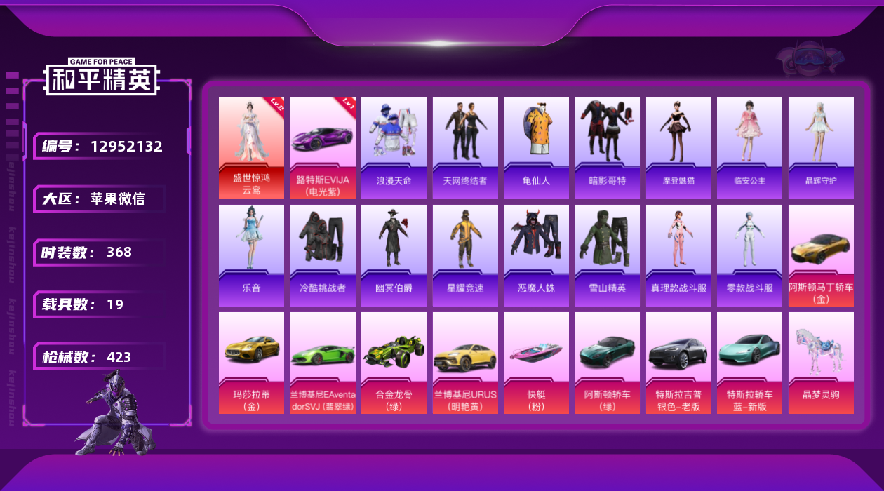 [12952132]素材身法号/老木乃伊/无敌战神框1/绝世印记2【特价急出/详情看图】:苹果 微信-无敌战神框-1神装-41粉装-22特效枪-19载具-17粉色飞行器-21w热力值-24王牌印记-368套装-423枪皮【红色载具】:路特斯EVIJA(电光紫)(一级)【红色神装等级】:盛世惊鸿-云鸾(二级)【热门品类】:粉装-怪诞乔克,粉装-雪国幻梦,粉装-梦幻火箭,粉装-缤纷油彩,套装-浪漫天命,套装-赤蝎幽灵,套装-都市猎人,套装-冥河战士,套装-派对舞王,套装-深海小丑鱼,套装-小丑鱼,套装-奇异狩猎者,套装-黄金大亨,套装-天网终结者,套装-金羽特工,套装-忍者信条,套装-动感兔斯基人偶服,套装-AG追光队服,套装-AG战队服,套装-SS1特训,套装-龟仙人,套装-暗影哥特,套装-萌熊伴侣,小丑红鼻头,小恶魔头饰,熔岩游骑兵面罩,M416-星际漫游,熔岩游骑兵连帽夹克【粉色载具】:特斯拉Model X(冷光银),特斯拉Roadster(水滴蓝),兰博基尼Aventador SVJ(翡翠绿),兰博基尼URUS(明艳黄),阿斯顿马丁DBS(绿),阿斯顿马丁DBS(金),阿斯顿马丁DBX(橙),路特斯EVIJA(电光紫),玛莎拉蒂Ghibli(金),玛莎拉蒂Ghibli(蓝),合金龙骨(绿),萌喵橘座,双人摩托-梦幻火箭,双人摩托-双刃魅影(绿),鬼马风驰,空客H135-蔚蓝之翼,快艇-塞莎KL27(霓虹粉),晶梦灵驹【粉色套装】:粉装-深海曼妙,粉装-幻影战神,粉装-数码大师,粉装-怪诞乔克,粉装-深渊皇后,粉装-甜心巧克力,粉装-宝贝奶油派,粉装-天使彩虹糖,粉装-雪国幻梦,粉装-蝶舞迷情,粉装-精灵迷巫,粉装-梦幻火箭,粉装-星之信仰,粉装-金风玉露,粉装-金属狂野,粉装-缤纷油彩,粉装-新星烈龙,粉装-向日葵,粉装-幻彩马卡龙,粉装-花间之火,粉装-俏皮狐尾,粉装-苍蓝魅影,粉装-冰霜白皇,粉装-炙焰红王,粉装-香水柠檬,粉装-相思残雪,粉装-虎啸骄阳,粉装-炙焰赤龙,粉装-飓风飞鹰,粉装-蜜桃特工,粉装-铁血龙王,角色-赛罗闪耀型,粉装-彩虹鹿灵,粉装-山涧鹿灵,角色-洛天依,粉装-海渊国主,角色-零号机款机体服,粉装-薄荷物语,粉装-妙趣可丽,角色-烟云彩露,角色-千金淑猫 【粉色枪皮等级】:AKM-甜心宝贝(七级),SCAR-L-梦幻火箭(三级),SCAR-L-童趣迷