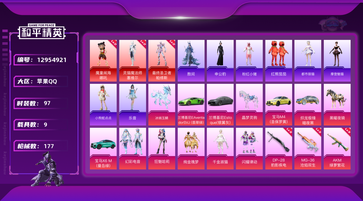 [12954921]素材身法号/老木乃伊/绝世印记1【特价急出/详情看图】:苹果 手Q-3神装-6粉装-9特效枪-9载具-8粉色飞行器-6.6w热力值-8王牌印记-97套装-177枪皮【红色神装等级】:魔童闹海-哪吒(二级),灵猫魔法师-塞维尔(二级),最终圣卫者-帕修斯(二级)【热门品类】:粉装-梦幻火箭,套装-冥河战士,套装-胖达圆圆,套装-动感兔斯基人偶服,套装-粉红小猪,套装-红熊茄茄【粉色载具】:兰博基尼Aventador SVJ(翡翠绿),兰博基尼Estoque(银翼灰),宝马M4(圣保罗黄),宝马X6 M(曼岛绿),炽龙极锋(暗夜黑),僚机-冰龙团团,晶梦灵驹,黑曜夜骑,冰绡玉鳞【粉色套装】:粉装-梦幻火箭,粉装-绚金瑰梦,粉装-闪耀律动,角色-千金淑猫,粉装-幻彩电音,角色-狂魅哈莉【粉色枪皮等级】:AKM-绿萝繁花(五级),AKM-幽焰骑士(三级),SCAR-L-魔童闹海 哪吒(三级),GROZA-镜光银凌(五级),Vector-最终圣卫者(三级),P90-魔童闹海 敖丙(三级),Kar98K-巳巳如意(五级),DP-28-豹影疾电(五级),MG-36-沧焰双生(五级)【粉色飞行器】:天之羽翼飞行器,龙翔九天飞行器,幽焰列车飞行器,终晖之翼飞行器,灵猫魔法师飞行器,飞天猪飞行器,灵珠游龙飞行器