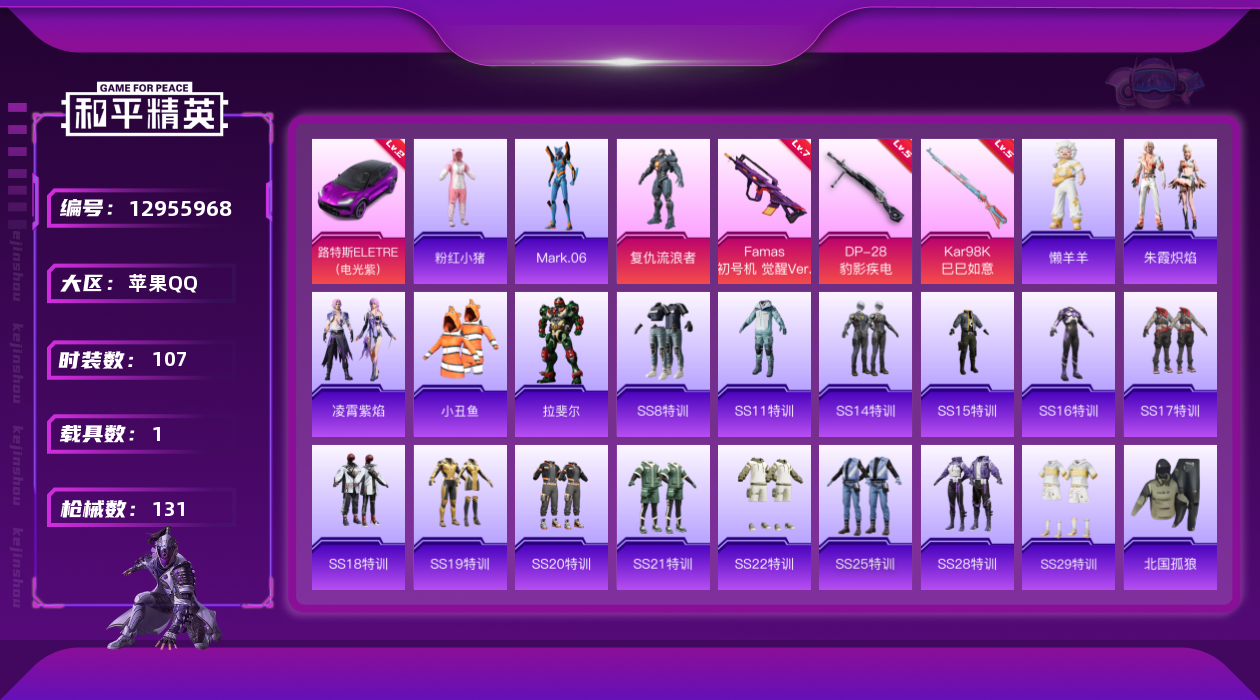 [12955968]苹果 手Q-1粉装-3特效枪-1载具-4.3w热力值-2王牌印记-107套装-131枪皮【红色载具】:路特斯ELETRE(电光紫)(二级)【热门品类】:套装-都市猎人,套装-深海小丑鱼,套装-小丑鱼,套装-粉红小猪,角色-Mark.06【粉色载具】:路特斯ELETRE(电光紫)【粉色套装】:角色-复仇流浪者【粉色枪皮等级】:Famas-初号机 觉醒Ver.(七级),Kar98K-巳巳如意(五级),DP-28-豹影疾电(五级)