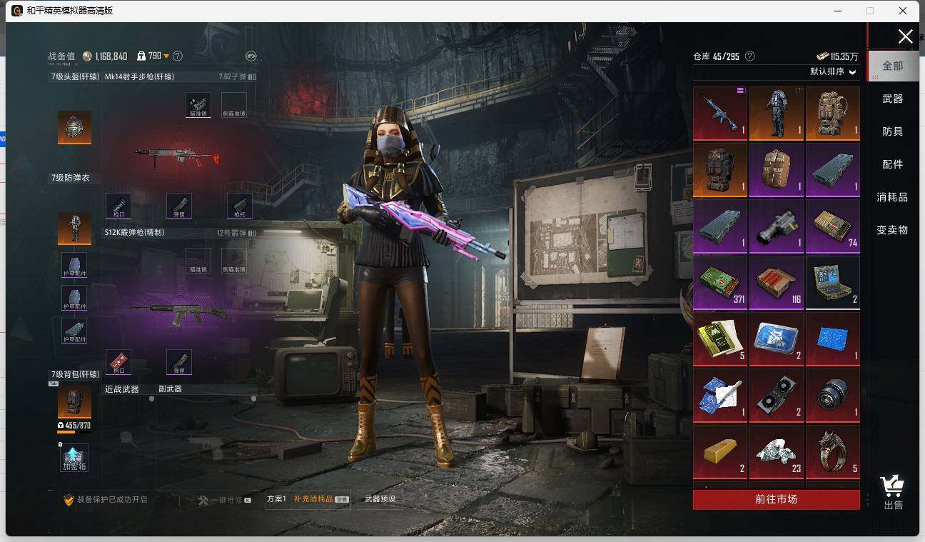 - [6260450]实名: 不可修改 时装数: 301 载具数: 2 枪械数: 102 战备数: 71 热门装扮: 深海小丑鱼,宝贝奶油派,迅捷狂鲨,沙场疾风,碧影闪光,恐龙拽拽,神秘黑猫,兔兔白日梦,音爆索尼克,女娲灵识 载具: 迈凯伦570S(天际蓝),宝马M4(圣保罗黄) 稀有枪皮: AKM炫紫旋律,SCAR-L青春物语,UMP45恐龙拽拽,Kar98K-巳巳如意,M200-伏羲圣卦