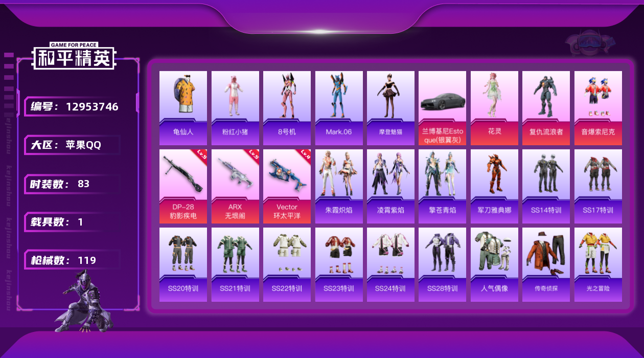 - PX_2093508- 苹果手Q-15王牌印记-12粉装-14特效枪-2载具-106246热力值-232套装-280枪皮-2卓越印记-0传奇印记 【12粉装】,雪国幻梦,梦幻火箭,初号机款机体服,缤纷油彩,狂魅哈莉,荧海星豚,盖世英雄,草莓生巧,萨利娅,绚金战神,数码大师,星之彼岸 【14特效枪】AKM-梦之光华-7级 SCAR-L-青春物语-7级 M416-心之恋语-6级 M416-灵猫魔法师-