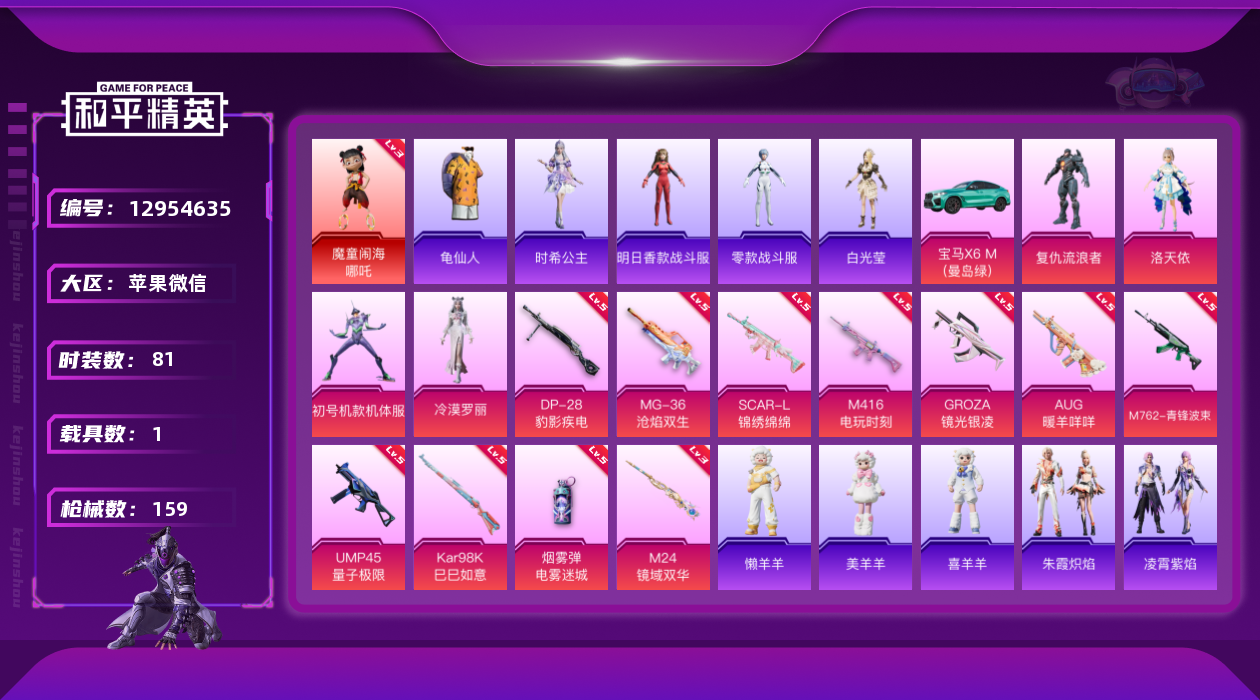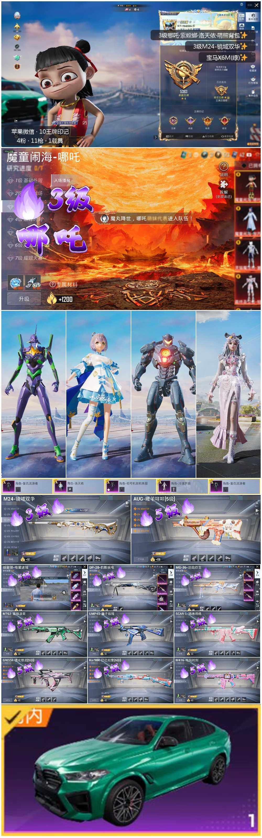 [12954635]素材身法号/绝世印记1/地铁满天赋【特价急出/详情看图】:苹果 微信-1神装-4粉装-11特效枪-1载具-9粉色飞行器-5.4w热力值-10王牌印记-81套装-159枪皮【红色神装等级】:魔童闹海-哪吒(三级)【热门品类】:套装-龟仙人【粉色载具】:宝马X6 M(曼岛绿)【粉色套装】:角色-洛天依,角色-初号机款机体服,角色-复仇流浪者,角色-冷漠罗丽【粉色枪皮等级】:SCAR-L-锦绣绵绵(五级),M416-电玩时刻(五级),GROZA-镜光银凌(五级),AUG-暖羊咩咩(五级),M762-青锋波束(五级),UMP45-量子极限(五级),Kar98K-巳巳如意(五级),M24-镜域双华(三级),DP-28-豹影疾电(五级),MG-36-沧焰双生(五级),烟雾弹-电雾迷城(五级)【粉色枪皮】:SCAR-L-锦绣绵绵,M416-电玩时刻,GROZA-镜光银凌,AUG-暖羊咩咩,M762-青锋波束,UMP45-量子极限,Kar98K-巳巳如意,M24-镜域双华,DP-28-豹影疾电,MG-36-沧焰双生,烟雾弹-电雾迷城【粉色飞行器】:酣梦熊熊飞行器,歌者泠鸢飞行器,镜光幻境飞行翼,动力核心飞行器,凤舞九天飞行器,万象金身飞行器,飞天猪飞行器