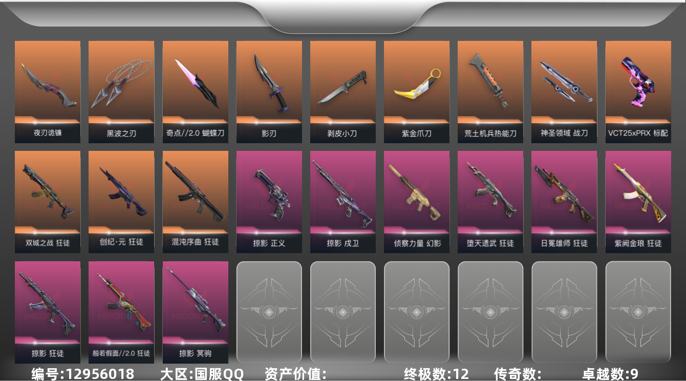 [12956018]【套装】:掠影套装 【英雄】:幻棱,炼狱,维斯,暮蝶,钛狐,壹决,铁臂,捷风,雷兹,幽影,不死鸟,贤者,猎枭,蝰蛇,零,芮娜,奇乐,尚勃勒,霓虹,斯凯,夜露,星礈,K/O,海神,盖可,黑梦,钢锁 【近战 武器】:近战武器-剥皮小刀,近战武器-奇点//2.0 蝴蝶刀,近战武器-紫金爪刀,近战武器-黑波之刃,近战武器-荒土机兵 热能刀,近战武器-夜刃诡镰,近战武器-影刃,近战武器-神圣领域 战刀 【狂徒】:狂徒-混沌序曲,狂徒-双城之战,狂徒-创·纪元,狂徒-般若假面//2.0,狂徒-堕天遗武,狂徒-掠影,狂徒-日冕雄师,狂徒-紫阙金琅,狂徒-荒土机兵 【幻影】:幻影-侦察力量,幻影-神圣领域,幻影-纳米打击 【戍卫】:戍卫-掠影,戍卫-逆冲蛮牛,戍卫-月球哨兵 【獠犬】:獠犬-神圣领域,獠犬-逆冲蛮牛 【冥驹】:冥驹-掠影,冥驹-荒土机兵,冥驹-星云暗涌 【莽侠】:莽侠-月球哨兵 【战神】:战神-神圣领域 【奥丁】:奥丁-纳米打击 【判官】:判官-纳米打击x 【雄鹿】:雄鹿-逆冲蛮牛,雄鹿-月球哨兵 【骇灵】:骇灵-荒土机兵,骇灵-星云暗涌 【蜂刺】:蜂刺-星云暗涌 【标配】:标配-荒土机兵 【VCT手枪】:标配-VCT25 x PRX 【正义】:正义-掠影,正义-超限闪存,正义-纳米打击,正义-月球哨兵 【鬼魅】:鬼魅-星云暗涌 【狂怒】:狂怒-神圣领域,狂怒-逆冲蛮牛 【卡面】:终章:激斗汉堡 卡面,进入射程 卡面,分崩离析 卡面,纳米打击 卡面,抑制技术 卡面,激斗汉堡 卡面,瓦娃脸雪糕 P2 卡面,从黄昏到黎明 卡面,荒土机兵 卡面,银弹猎手 卡面,逆冲蛮牛 卡面,《双城之战》拥抱 卡面,精灵大战 卡面,欢迎来到底城 卡面,南瓜盛典 卡面,修车达人 卡面,正义的化身 卡面,梦幻奶茶 卡面,战术熊与伙伴们 卡面,沙雕爆能器 卡面,无畏契约GO!第一卷:芮娜 卡面,清除名单 卡面,无畏契约GO!第一卷:零 卡面,暗枪 卡面,夯实根基 卡面,"Luie" 卡面,热烈欢迎 卡面,铁臂设计图 卡面,代号红色 卡面,冰淇淋店 卡面,新兵报到 卡面,V契约 卡面,无畏契约 卡面 【喷漆】:小小心意 喷漆,战“素”兔 喷漆,宇宙的指引 喷漆,请求重启 喷漆,逆冲蛮牛 喷漆,纳米打击 喷漆,鼻尖上的蝴蝶 喷漆,简笔画黯兽 喷漆,独守蝰腹 喷漆,他们将落荒而逃 喷漆,通缉:战术