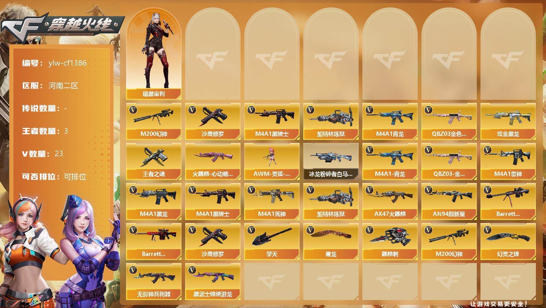 [12953810]河南二区-23V-3王者-1炫金 【热门武器】:QBZ03-金色蔷薇,M4A1-青龙,M200-幻神,M4A1-黑骑士,加特林-炼狱,沙鹰-修罗*2 【王者炫金武器】:炫金黑龙,王者之魂 【稀有皮肤】:火麒麟-心动糖果 【角色】:暗黑审判 【人偶武器】:AWM-灵狐-15周年嘉年华 【挑战大师】:冰龙粉碎者-白马银枪 【英雄级武器】:幻灵之锋,QBZ03-金色蔷薇,M4A1-青龙,无影-神兵利器,M4A1-雷神,M4A1-黑龙,M4A1-黑骑士,M4A1-死神,加特林-炼狱,AK47-火麒麟,AN94-超新星,Barrett-毁灭,Barrett-极光,M200-幻神,黑武士-锦绣游龙,沙鹰-修罗*2,麒麟刺,擎天,屠龙 【特殊枪械】1黑骑士,