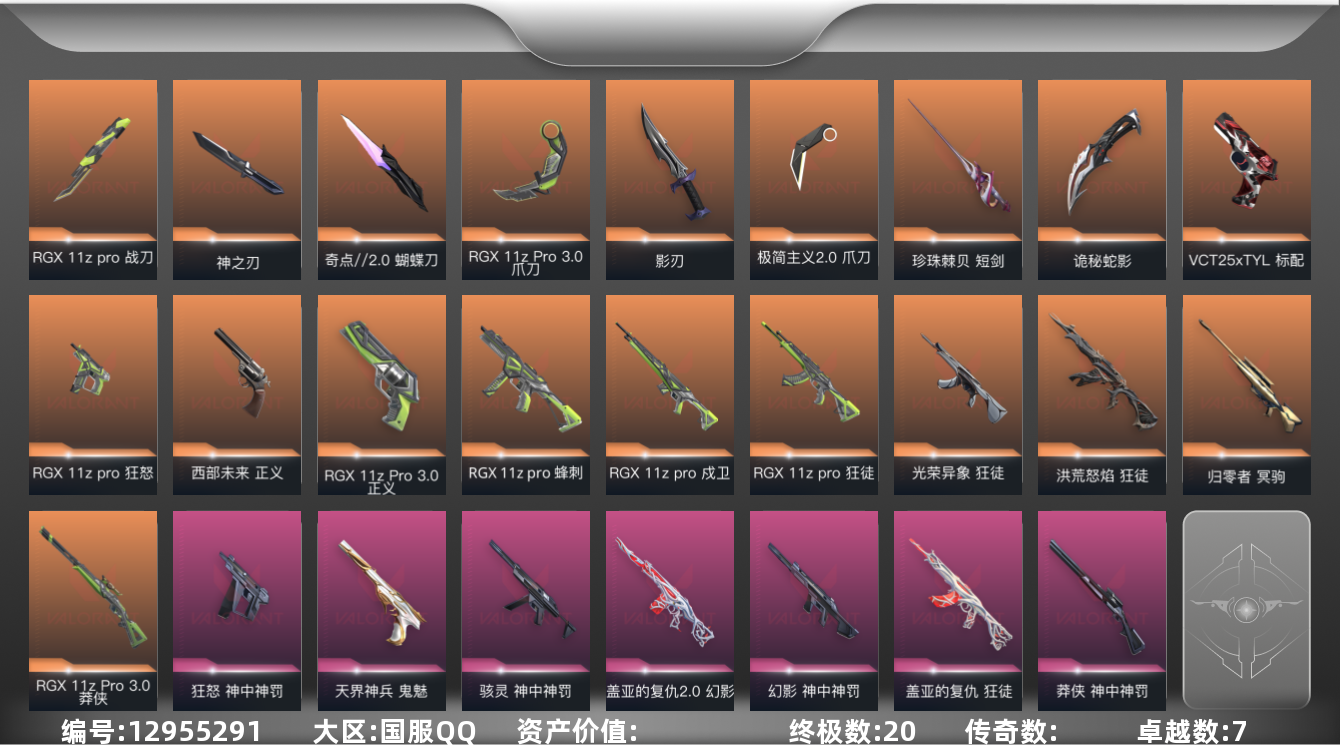 [12955291]【套装】:RGX 11z Pro//3.0套装,RGX 11z Pro套装,神中神罚套装,极简主义//2.0套装 【英雄】:幻棱,炼狱,维斯,暮蝶,钛狐,壹决,铁臂,捷风,雷兹,幽影,不死鸟,贤者,猎枭,蝰蛇,零,芮娜,奇乐,尚勃勒,霓虹,斯凯,夜露,星礈,K/O,海神,盖可,黑梦,钢锁 【近战 武器】:近战武器-RGX 11z Pro//3.0 爪刀,近战武器-奇点//2.0 蝴蝶刀,近战武器-神之刃,近战武器-RGX 11z Pro 战刀,近战武器-极简主义//2.0 爪刀,近战武器-珍珠棘贝 短剑,近战武器-影刃,近战武器-诡秘蛇影 军刀 【狂徒】:狂徒-洪荒怒焰,狂徒-RGX 11z Pro,狂徒-光荣异象,狂徒-盖亚的复仇,狂徒-诡秘蛇影,狂徒-极简主义//2.0 【幻影】:幻影-盖亚的复仇//2.0,幻影-神中神罚,幻影-珍珠棘贝,幻影-末日之翼 【戍卫】:戍卫-RGX 11z Pro,戍卫-珍珠棘贝,戍卫-折光棱晶 【獠犬】:獠犬-极简主义//2.0,獠犬-复古浪潮 【冥驹】:冥驹-归零者,冥驹-复古浪潮 【飞将】:飞将-极简主义//2.0,飞将-末日之翼 【莽侠】:莽侠-RGX 11z Pro//3.0,莽侠-神中神罚,莽侠-诡秘蛇影,莽侠-深海水族 【战神】:战神-深海水族 【奥丁】:奥丁-末日之翼 【判官】:判官-诡秘蛇影 【雄鹿】:雄鹿-复古浪潮 【骇灵】:骇灵-神中神罚,骇灵-珍珠棘贝 【蜂刺】:蜂刺-RGX 11z Pro,蜂刺-深海水族,蜂刺-折光棱晶 【标配】:标配-超能偶像,标配-折光棱晶 【VCT手枪】:标配-VCT25 x TYL 【正义】:正义-RGX 11z Pro//3.0,正义-西部未来,正义-传奇制造,正义-复古浪潮 【鬼魅】:鬼魅-天界神兵,鬼魅-流星兵团,鬼魅-诡秘蛇影,鬼魅-极简主义//2.0,鬼魅-星云暗涌 【狂怒】:狂怒-RGX 11z Pro,狂怒-神中神罚,狂怒-珍珠棘贝 【短炮】:短炮-深海水族,短炮-末日之翼 【卡面】:《双城之战》拥抱 卡面,精灵大战 卡面,欢迎来到底城 卡面,南瓜盛典 卡面,无畏契约:暮蝶 卡面,修车达人 卡面,正义的化身 卡面,终章:生意人麦宝 卡面,铁之华 卡面,时间到 卡面,最高舞台 卡面,RGX 11z Pro//3.0 卡面,树懒大作战 卡面,声感陷阱设计图 卡面,红鳞松