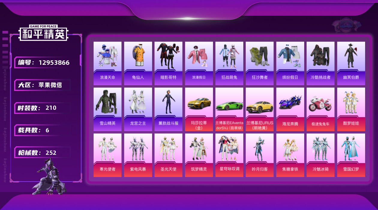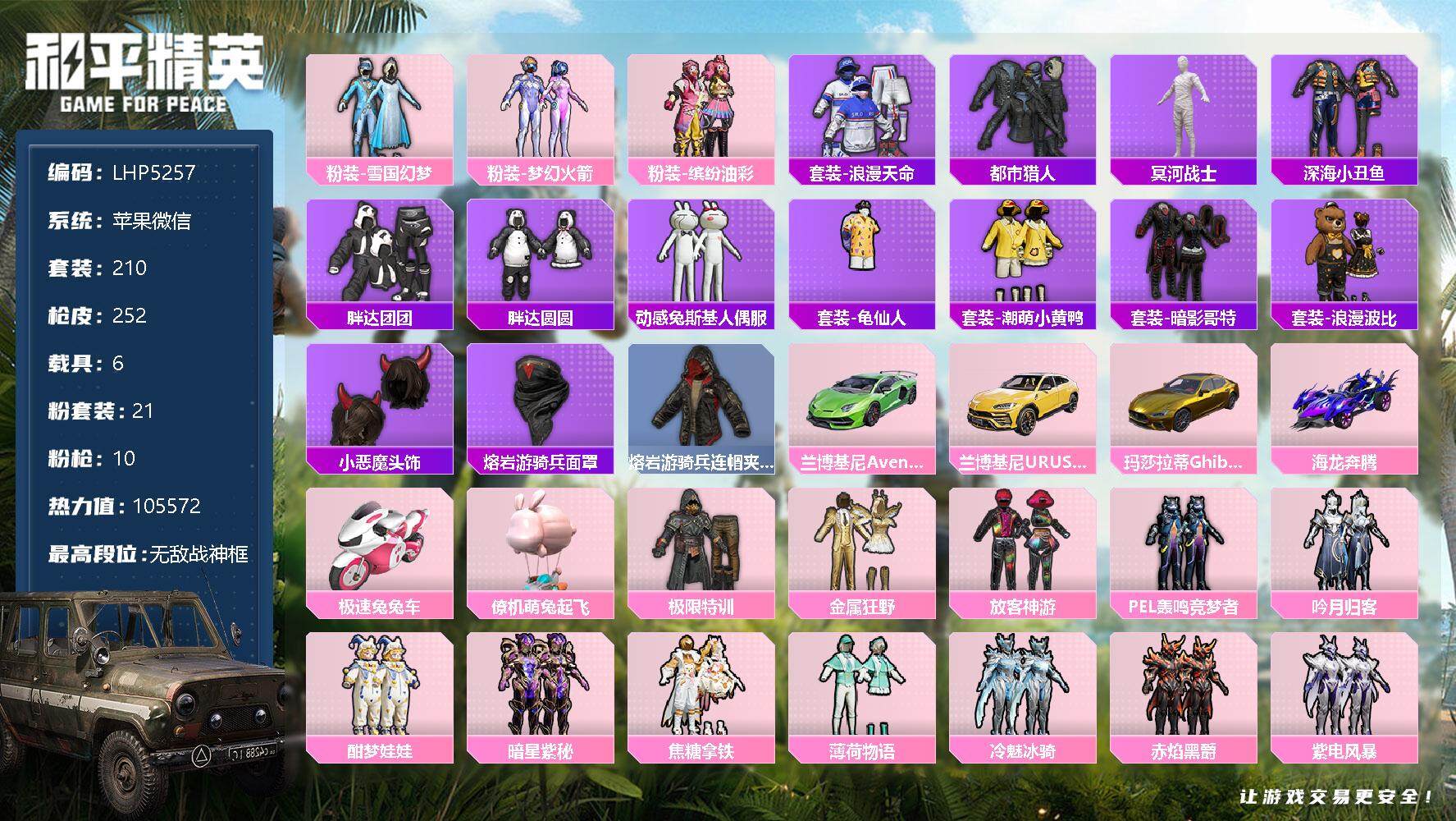 [12953866]素材身法号/老木乃伊/无敌战神框1/绝世印记6【特价急出/详情看图】:苹果 微信-无敌战神框-21粉装-10特效枪-6载具-6粉色飞行器-10.5w热力值-19王牌印记-210套装-252枪皮【热门品类】:粉装-雪国幻梦,粉装-梦幻火箭,粉装-缤纷油彩,套装-浪漫天命,套装-都市猎人,套装-冥河战士,套装-深海小丑鱼,套装-胖达团团,套装-胖达圆圆,套装-动感兔斯基人偶服,套装-龟仙人,套装-潮萌小黄鸭,套装-暗影哥特,套装-浪漫波比,小恶魔头饰,熔岩游骑兵面罩,熔岩游骑兵连帽夹克【粉色载具】:兰博基尼Aventador SVJ(翡翠绿),兰博基尼URUS(明艳黄),玛莎拉蒂Ghibli(金),海龙奔腾,极速兔兔车,僚机-萌兔起飞【粉色套装】:粉装-极限特训,粉装-雪国幻梦,粉装-梦幻火箭,粉装-金属狂野,粉装-缤纷油彩,粉装-放客神游,粉装-PEL轰鸣竞梦者,粉装-吟月归客,粉装-酣梦娃娃,粉装-暗星紫秘,粉装-焦糖拿铁,粉装-薄荷物语,粉装-冷魅冰骑,粉装-赤焰黑爵,粉装-紫电风暴,粉装-筑梦精灵,粉装-甜梦小狐,粉装-圣光天使,粉装-霞光圣骑,粉装-寒光使者,粉装-星穹咏叹调【粉色枪皮等级】:AKM-梦之光华(七级),SCAR-L-青春物语(一级),SCAR-L-甜梦小狐(七级),M416-五爪金龙(七级),GROZA-焦糖拿铁(七级),M762-冷魅冰骑(六级),Vector-环太平洋(七级),Kar98K-巳巳如意(二级),AMR-智耀战神(七级),DP-28-豹影疾电(五级)【粉色飞行器】:梦幻火箭飞行器,天之羽翼飞行器,焦糖拿铁飞行器,冷魅冰骑飞行器,星夜魔法师飞行翼,圣光天使飞行器