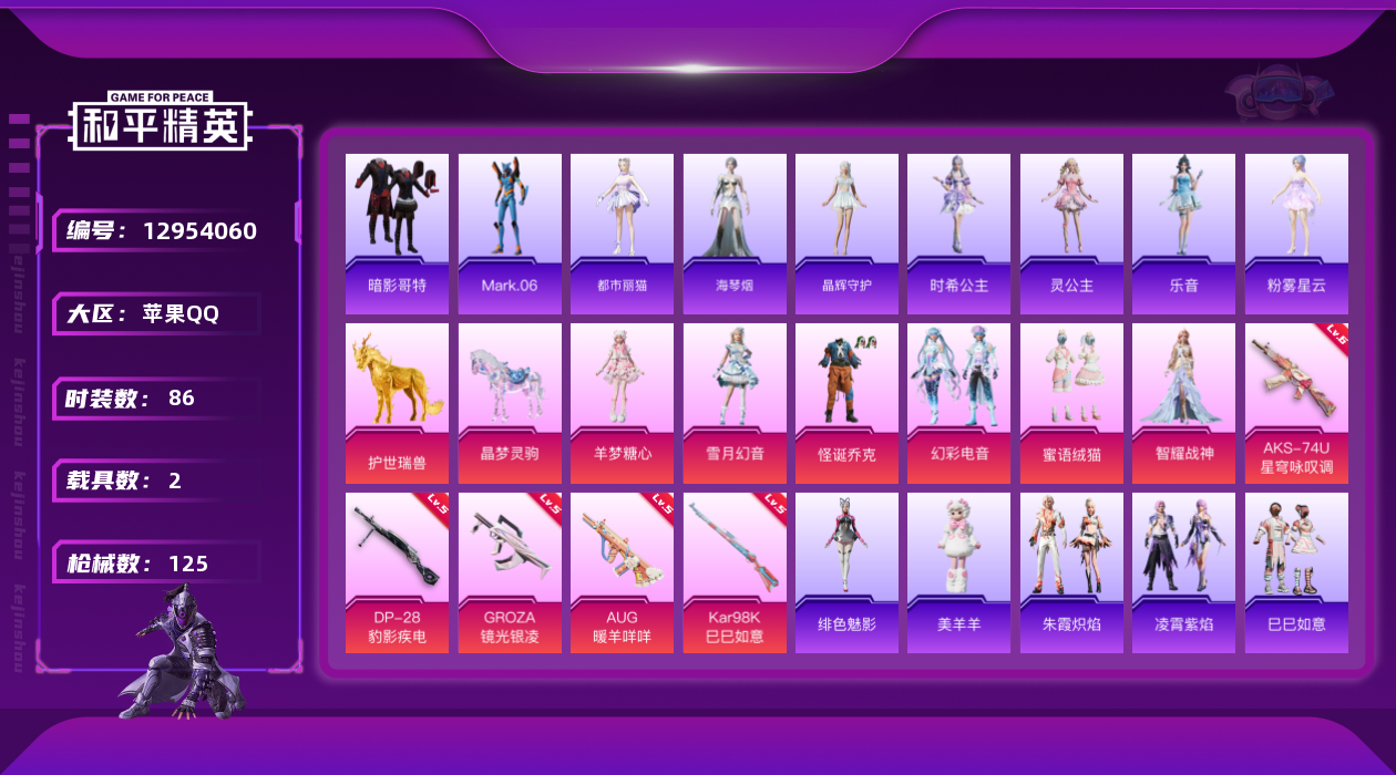 [12954060]素材身法号/地铁满天赋【特价急出/详情看图】:苹果 手Q-8粉装-6特效枪-2载具-3粉色飞行器-4w热力值-5王牌印记-86套装-125枪皮【热门品类】:粉装-怪诞乔克,粉装-梦幻火箭,套装-派对舞王,套装-暗影哥特,角色-Mark.06,小丑红鼻头【粉色载具】:护世瑞兽,晶梦灵驹【粉色套装】:粉装-怪诞乔克,粉装-梦幻火箭,粉装-蜜语绒猫,粉装-雪月幻音,角色-智耀战神,粉装-幻彩电音,角色-羊梦糖心【粉色枪皮等级】:GROZA-镜光银凌(五级),AUG-暖羊咩咩(五级),AKS-74U-星穹咏叹调(六级),Kar98K-巳巳如意(五级),Mk14-甜梦熊击(五级),DP-28-豹影疾电(五级)【粉色飞行器】:万象金身飞行器,灵猫魔法师飞行器,灵珠游龙飞行器