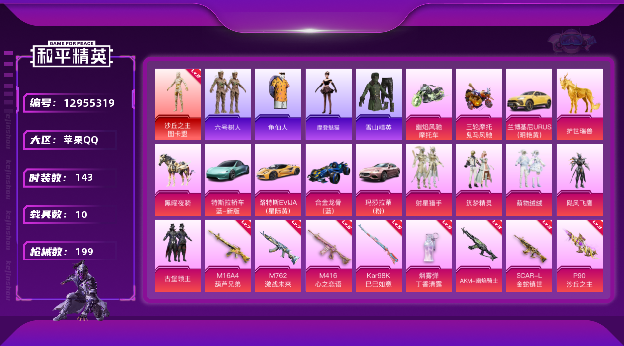 [12955319]素材身法号 苹果 手Q-1神装-6粉装-8特效枪-10载具-10粉色飞行器-7.9w热力值-10王牌印记-143套装-199枪皮【红色神装等级】:沙丘之主-图卡盟(二级)【热门品类】:粉装-梦幻火箭,套装-奇异狩猎者,套装-六号树人,套装-龟仙人,熔岩游骑兵面罩,熔岩游骑兵连帽夹克【粉色载具】:特斯拉Roadster(水滴蓝),兰博基尼URUS(明艳黄),路特斯EVIJA(星际黄),玛莎拉蒂Ghibli(粉),合金龙骨(蓝),幽焰风驰摩托车,鬼马风驰,僚机-圣域龙宝,护世瑞兽,黑曜夜骑【粉色套装】:粉装-梦幻火箭,粉装-古堡领主,粉装-飓风飞鹰,粉装-筑梦精灵,粉装-萌物绒绒,粉装-射星猎手【粉色枪皮等级】:AKM-幽焰骑士(三级),M16A4-葫芦兄弟(七级),SCAR-L-金蛇镇世(三级),M416-心之恋语(六级),M762-激战未来(七级),P90-沙丘之主(三级),Kar98K-巳巳如意(五级),烟雾弹-丁香清露(五级)【粉色飞行器】:酣梦熊熊飞行器,萌物绒绒飞行器,沙丘之主天马,镜域双华-灵镜之阶,龙翔九天飞行器,深渊漩涡飞行器,幽焰列车飞行器,万象金身飞行器,圣域金龙飞行器,灵猫魔法师飞行器
