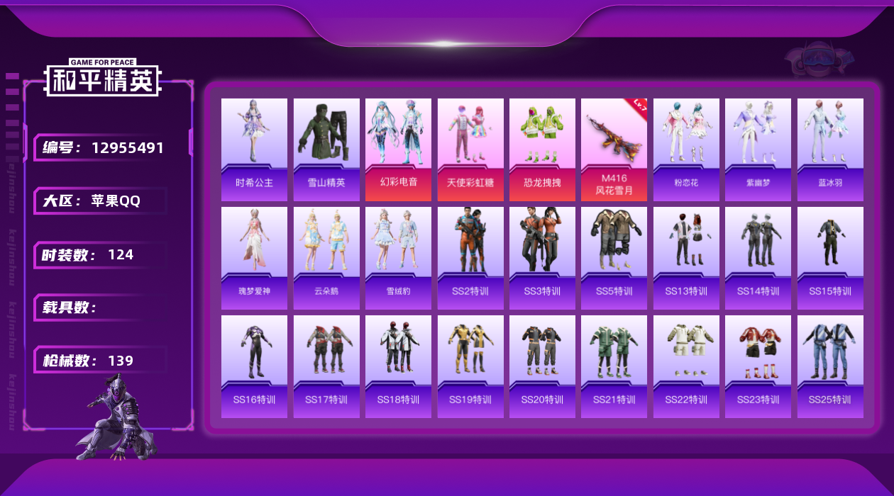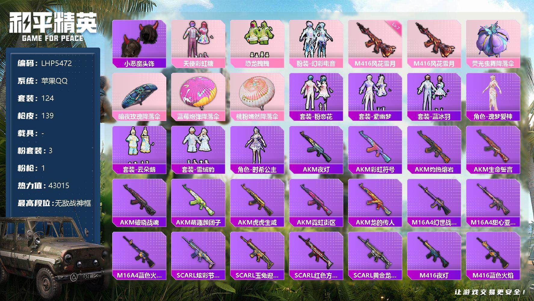 [12955491]无敌战神框1 苹果 手Q-无敌战神框-3粉装-1特效枪-4.3w热力值-9王牌印记-124套装-139枪皮【热门品类】:小恶魔头饰【粉色套装】:粉装-天使彩虹糖,粉装-恐龙拽拽,粉装-幻彩电音【粉色枪皮等级】:M416-风花雪月(七级)