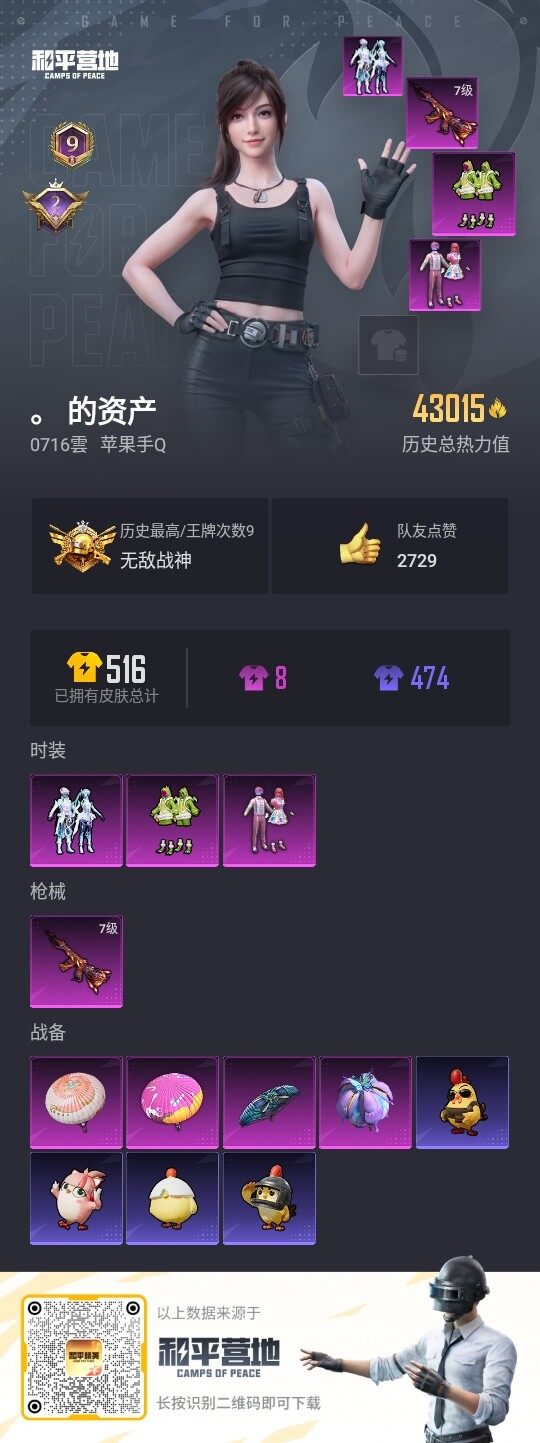 - 苹果QQ 可二次 当前段位不朽星钻Ⅳ 历史最高段位无敌战神 热力值81472 等级70 套装189 王牌次数10 点券6 外观套装15 枪械皮肤6 热门紫装26 载具0 飞行器0 稀有0 头盔4 背包7