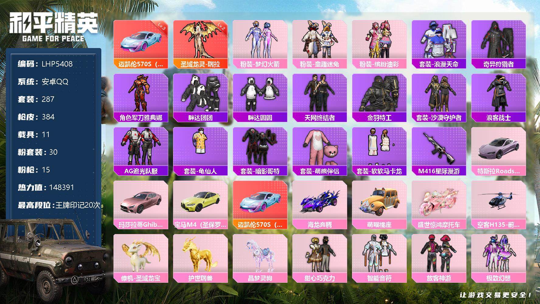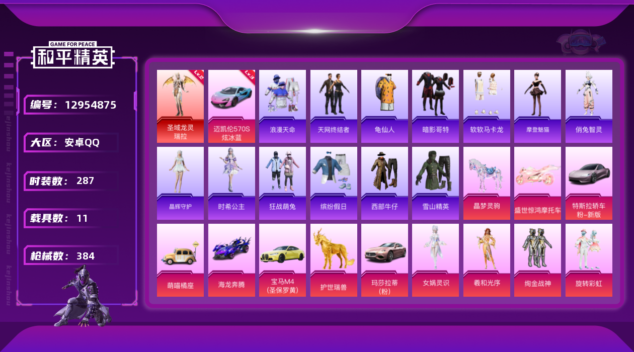 [12954875]素材身法号/绝世印记1【特价急出/详情看图】:安卓 手Q-1神装-30粉装-15特效枪-11载具-12粉色飞行器-14.8w热力值-20王牌印记-287套装-384枪皮【红色载具】:迈凯伦570S(炫冰蓝)(三级)【红色神装等级】:圣域龙灵-瑞拉(二级)【热门品类】:粉装-梦幻火箭,粉装-童趣迷兔,粉装-缤纷油彩,套装-浪漫天命,套装-奇异狩猎者,角色-军刀雅典娜,套装-胖达团团,套装-胖达圆圆,套装-天网终结者,套装-金羽特工,套装-沙漠守护者,套装-浪客战士,套装-AG追光队服,套装-龟仙人,套装-暗影哥特,套装-萌熊伴侣,套装-软软马卡龙,M416-星际漫游【粉色载具】:特斯拉Roadster(沁心粉),玛莎拉蒂Ghibli(粉),宝马M4(圣保罗黄),迈凯伦570S(炫冰蓝),海龙奔腾,萌喵橘座,盛世惊鸿摩托车,空客H135-蔚蓝之翼,僚机-圣域龙宝,护世瑞兽,晶梦灵驹【粉色套装】:粉装-甜心巧克力,粉装-梦幻火箭,粉装-智能音符,粉装-缤纷油彩,粉装-放客神游,粉装-极致幻想,粉装-花间之火,粉装-苍蓝魅影,粉装-绚金战神,粉装-银刃赛罗,粉装-冰霜白皇,粉装-童趣迷兔,粉装-炙焰红王,粉装-暗翼战神,粉装-王牌四分卫,粉装-绮梦青鸾,粉装-星之彼岸,粉装-旋转彩虹,粉装-启明星,粉装-暗夜鎏金,粉装-炫光之旅,角色-烟云彩露,角色-女娲灵识,角色-羲和光序,角色-晶梦幻蝶,角色-樱桃泡泡,粉装-戏水时光,粉装-星月云朵,粉装-雪月幻音,角色-绯穹魔姬【粉色枪皮等级】:AKM-炫紫旋律(六级),SCAR-L-童趣迷兔(七级),M416-五爪金龙(七级),M416-心之恋语(七级),AUG-星之彼岸(六级),UZI-绮梦青鸾(四级),UMP45-启明星(五级),汤姆逊-星月云朵(四级),Kar98K-巳巳如意(五级),Kar98K-圣域龙灵(一级),Mk14-樱桃泡泡(四级),M417-第五大道(四级),DP-28-暗夜鎏金(三级),DP-28-豹影疾电(五级)【粉色飞行器】:酣梦熊熊飞行器,童趣迷兔飞行器,暗翼战神飞行器,王牌四分卫飞行器,绮梦青鸾飞行器,星之彼岸飞行器,凤舞九天飞行器,万象金身飞行器,戏水时光飞行器,星月云朵飞行器,圣域金龙飞行器