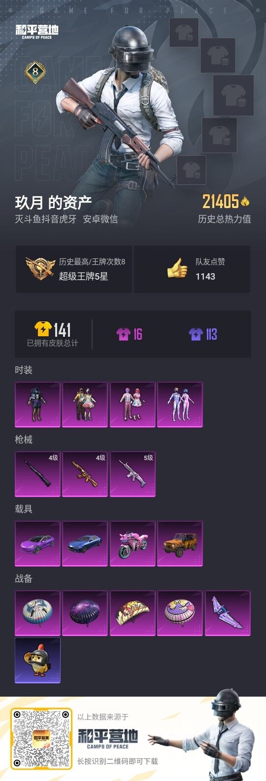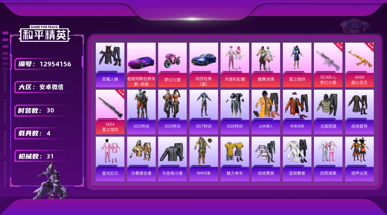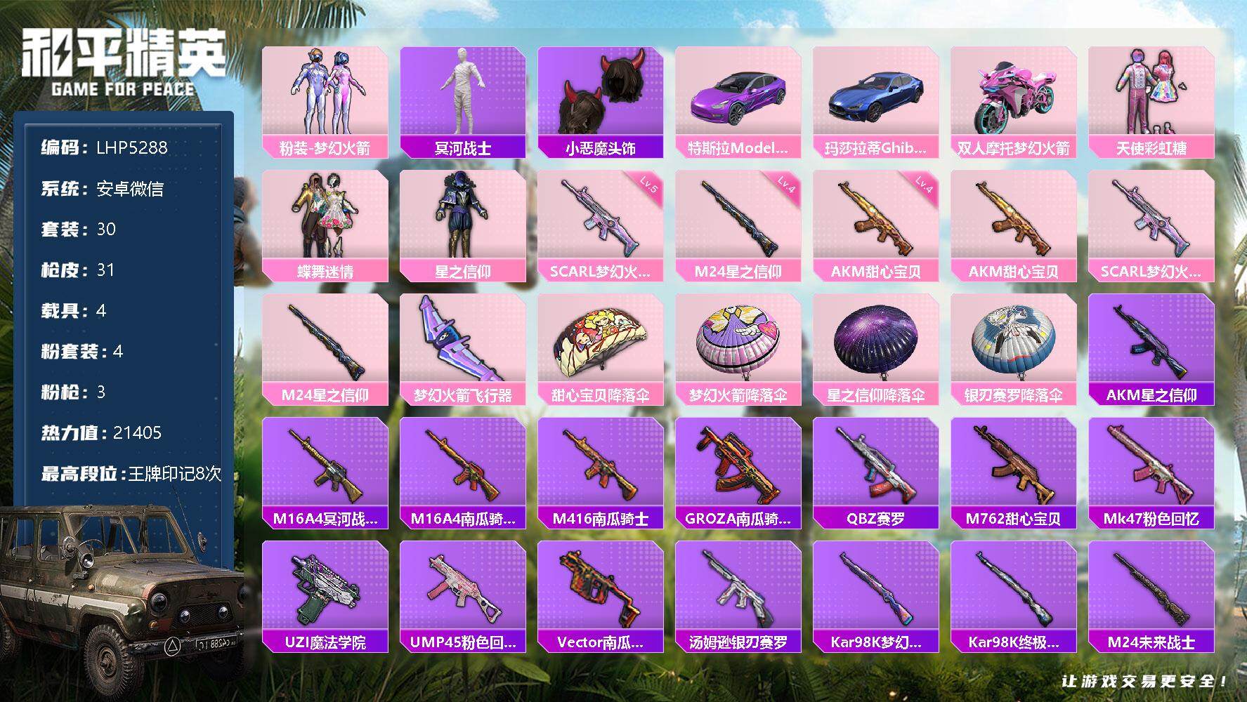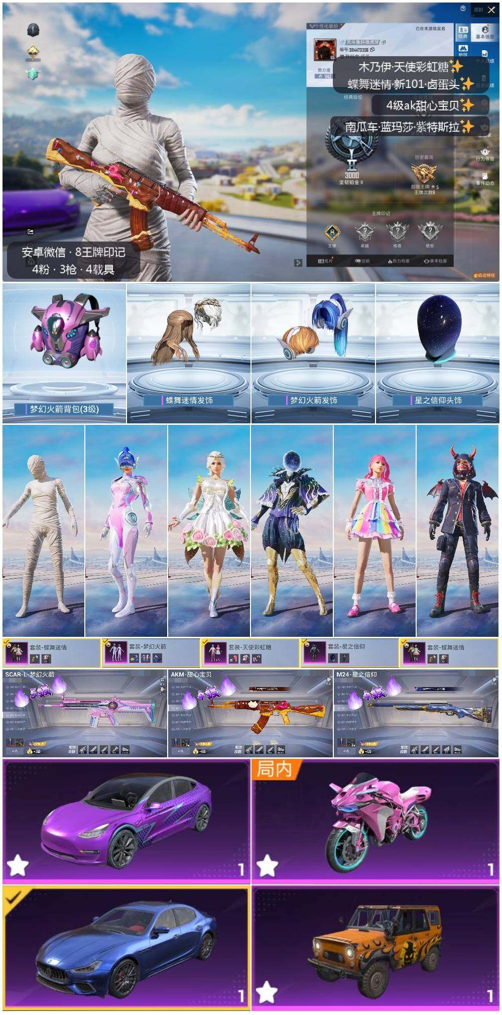 [12954156]素材身法号/老木乃伊【特价急出/详情看图】:安卓 微信-4粉装-3特效枪-4载具-1粉色飞行器-2.1w热力值-8王牌印记-30套装-31枪皮【热门品类】:粉装-梦幻火箭,套装-冥河战士,小恶魔头饰【粉色载具】:特斯拉Model 3(奇幻紫),玛莎拉蒂Ghibli(蓝),双人摩托-梦幻火箭【粉色套装】:粉装-天使彩虹糖,粉装-蝶舞迷情,粉装-梦幻火箭,粉装-星之信仰【粉色枪皮等级】:AKM-甜心宝贝(四级),SCAR-L-梦幻火箭(五级),M24-星之信仰(四级)【粉色飞行器】:梦幻火箭飞行器