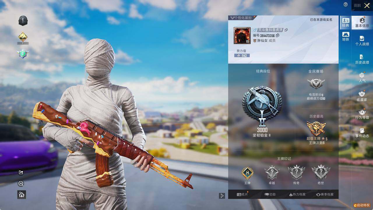 - [11883128]11粉装 5特效枪 2载具 10印记 可二次 可修改实名 女号 优质装备:宾利BATUR(极速紫),宾利欧陆GT敞篷(火焰橘),宝贝奶油派,天使彩虹糖,M416全功率超战,M416风花雪月,SCAR-L纯梦嫁纱,AKM绿萝繁花 热门装扮:飓风飞鹰,彩虹鹿灵,山涧鹿灵,沙场疾风,恐龙拽拽,寒光使者,音爆索尼克,超级赛亚人孙悟空,超级赛亚人贝吉塔,闲梦青缨,东方飞龙,暗夜魅影 稀有枪皮:DP-28-豹影疾电 五级特效枪:五级DP-28-豹影疾电,五级M416-全功率超战,五级SCAR-L-纯梦嫁纱,五级AKM-绿萝繁花 三级特效枪:三级M416-风花雪月 紫色装扮:田园牧歌,轻风白浪,和煦暖阳,SS22特训,莱茵河畔,孙悟空,SS23特训,幻彩翩翩,妙红点点,娇憨猪猪,酸甜橘柚,夏雨游龙,萌趣咩咩,SS21特训,绚烂繁星,熠彩粉晶,冷焰舞者,北国孤狼,午夜朋克,SS33特训套装,青涩时光,SS20特训,SS15特训,时空追击者,暴风机械师,SS16特训,爆裂葡萄,萌趣颜团子,特种颜团子,猎梦纪元,飞驰魅影,音速流光,极速竞梦,SS19特训,覆海蛟龙,甜心亚梦,虚音幻奏,电音精灵,瑞龙福将,团圆交子,醒狮腾龙,SS17特训,极乐追光,异彩先驱,SS18特训,都市漫游者,都市魅力,野性山猫,野性战心,野性战魂,长空猛禽,雷霆特警,霓虹极客,霓虹街区,青春校园,迎春赐吉,缤纷果语,耀眼新星,花园小羊咩,蓝色守护者,虎虎生威吉莉,血色贵族,西部风情,风行保卫者,飞行日记,龙腾端午,骑行爱好者,魅力单车,鹤鸣,麻辣教官,黑色伏地魔,龙的传人,龟仙人,柠萌假日,格斗先锋,棕色飞行服,水手小飞鸭,沙漠探路者,活力之魂,涂山之恋,滨海假日,夏日音浪,夜莺强袭者,幻世战舞者,怒火燎原,探宝勇士,湖蓝色名流,滨海厨神,白熊同盟,破蛋小黄鸡,神秘领域,福星高照,空岛之星,空投萌叽,突袭者,甜蜜熊情侣,王牌教练,牛气冲天,灼焰舞者,炫蓝之夏,燃烧卡路里,牛气满满,猛禽,特战装甲,短笛,玉兔迎春,竞技名士,惊鸿侠骨,贝吉塔,究极悟饭,神气柴柴,懵萌河马,SS24特训(SS24特训套装),SS25特训,锦衣飞扬,粉红小猪,菲菲,SS27特训,星河浪客,华灯初上,日照花林,沙丘之歌,SS26特训,春光漫游,快闪甜心,薄荷蓝莓,耀粉歌者,绯格组合,萌黄之夏,水银刺客,光之冒险,海上生明月