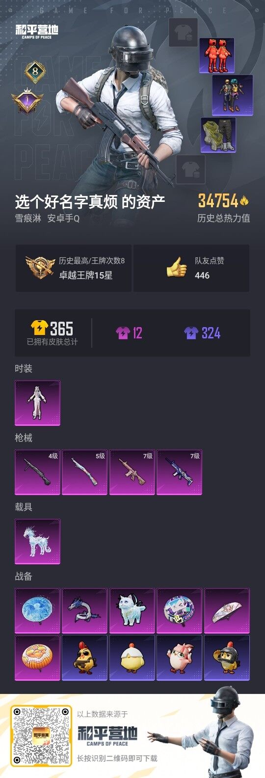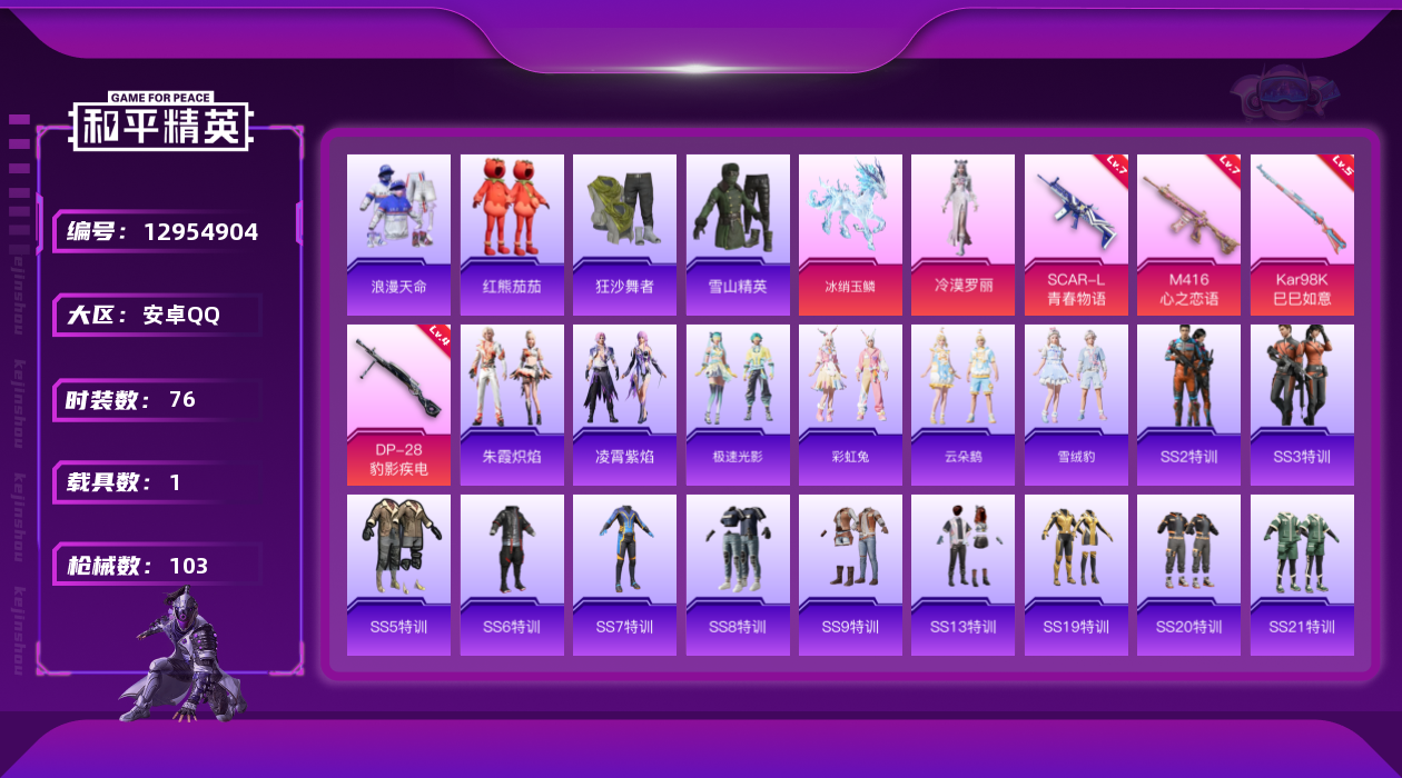 - PX_2094951- 安卓手Q-15王牌印记-12粉装-6特效枪-1载具-93062热力值-206套装-292枪皮-4卓越印记-0传奇印记 【12粉装】,新星烈龙,冷漠罗丽,罗征,彩虹甜喵,幻影飞狐,飒粉甜心,镜光幻境,莲影清波,暗夜鎏金,创世·救赎,小蓝,美琪 【6特效枪】SCAR-L-锦绣绵绵-5级 M416-电玩时刻-5级 M416-风花雪月-7级 AUG-圣斗士星矢-7级 Kar98K-