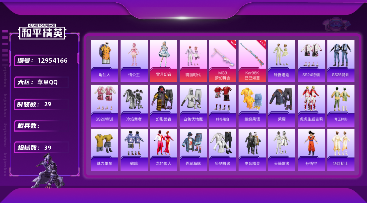 [12954166]【特价急出/详情看图】:苹果 手Q-3粉装-2特效枪-1.2w热力值-1王牌印记-29套装-39枪皮【热门品类】:套装-龟仙人【粉色套装】:粉装-瑰丽时代,粉装-绿野邂逅,粉装-雪月幻音【粉色枪皮等级】:Kar98K-巳巳如意(三级),MG3-梦幻舞会(七级)