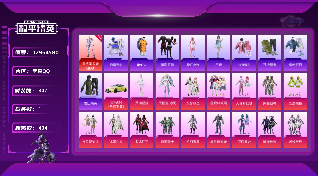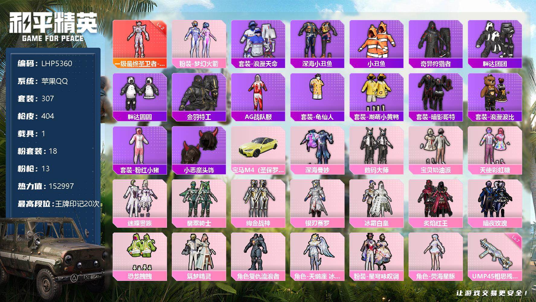 - [12583011]苹果 手Q-9粉装-11特效枪-2载具-7粉色飞行器-119502热力值-19王牌印记-250套装-344枪皮 【红色载具】:宝马M4(灿阳金)(三级) 【热门品类】:粉装-繁龙极客,套装-浪漫天命,套装-赤蝎幽灵,套装-都市猎人,套装-派对舞王,套装-胖达圆圆,旭日初心兜帽大衣,套装-龟仙人,套装-暗影哥特,套装-粉红小猪,M416-星际漫游 【粉色载具】:宝马M4(灿阳金),星河领航(磐石银) 【粉色套装】:粉装-粉色回忆,粉装-烈焰拳霸,粉装-流星咚咚,粉装-第五大道,粉装-瑰丽时代,粉装-繁龙极客,粉装-金丰海韵,粉装-星穹咏叹调,角色-绯穹魔姬 【粉色枪皮等级】:AKM-梦之光华(六级),SCAR-L-时空协奏(三级),M416-五爪金龙(七级),AUG-暖羊咩咩(五级),AUG-圣斗士星矢(六级),UMP45-量子极限(五级),Kar98K-巳巳如意(五级),DP-28-豹影疾电(五级),MG3-梦幻舞会(七级),平底锅-喜羊羊与灰太狼(三级),破片手榴弹-瓶中星球(七级) 【粉色枪皮】:AKM-梦之光华,SCAR-L-时空协奏,M416-五爪金龙,AUG-暖羊咩咩,AUG-圣斗士星矢,UMP45-量子极限,Kar98K-巳巳如意,DP-28-豹影疾电,MG3-梦幻舞会,平底锅-喜羊羊与灰太狼,破片手榴弹-瓶中星球 【粉色飞行器】:梦之光华飞行器,齐天大圣飞行器,黄族统领飞行器,萌物绒绒飞行器,镜光幻境飞行翼,沙丘之主天马,飞天猪飞行器 【粉色降落伞】:龙虾霸霸降落伞,四圣焕新降落伞,王牌四分卫降落伞,暗夜玫瑰降落伞,齐天大圣降落伞,妙趣可丽降落伞,千面幻镜降落伞,歌者泠鸢降落伞,仲夏莫吉托降落伞,未来歌姬降落伞,莲影清波降落伞,精灵梦叶罗丽降落伞,墨龙九天降落伞,千金淑猫降落伞,月下星之子降落伞,幻海仙踪降落伞,星穹咏叹调降落伞,时光之吻降落伞,冷漠罗丽降落伞,喜羊羊与灰太狼降落伞,魔童闹海 哪吒降落伞 【稀有套装】:套装-龟仙人,套装-巳巳如意,套装-雏菊兔兔,套装-萝兰蝴蝶,套装-小熊娃娃,套装-火种守卫者,套装-糖糖葫芦,套装-青团波波,套装-棉花软糖,角色-都市丽猫,角色-临安公主,套装-燕燕于飞,套装-鱼渊荷华,套装-新风雅兰,套装-粉恋花,套装-紫幽梦,套装-蓝冰羽,套装-星影赞美诗,套装-星渊小夜曲,套装-彩虹兔,套装-云朵鹅,套装-雪