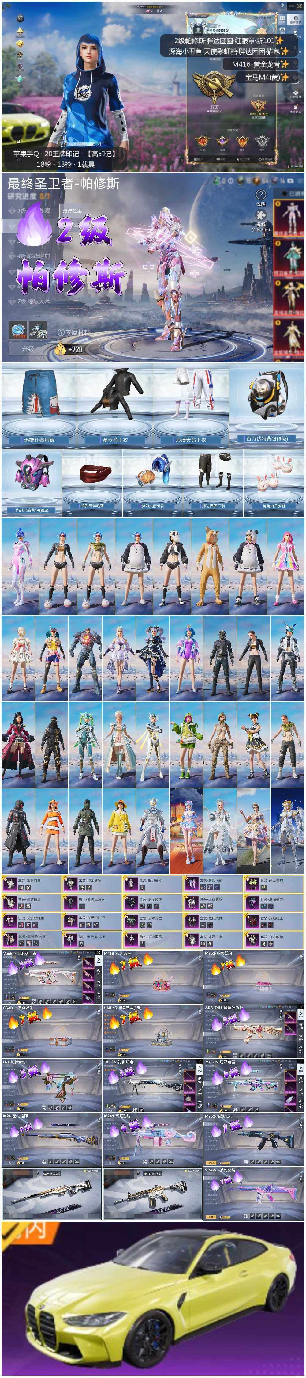 [12954580]素材身法号【特价急出/详情看图】:苹果 手Q-1神装-18粉装-13特效枪-1载具-7粉色飞行器-15.2w热力值-20王牌印记-307套装-404枪皮【红色神装等级】:最终圣卫者-帕修斯(二级)【热门品类】:粉装-梦幻火箭,套装-浪漫天命,套装-深海小丑鱼,套装-小丑鱼,套装-奇异狩猎者,套装-胖达团团,套装-胖达圆圆,套装-金羽特工,套装-AG战队服,套装-龟仙人,套装-潮萌小黄鸭,套装-暗影哥特,套装-浪漫波比,套装-粉红小猪,小恶魔头饰【粉色载具】:宝马M4(圣保罗黄)【粉色套装】:粉装-深海曼妙,粉装-数码大师,粉装-宝贝奶油派,粉装-天使彩虹糖,粉装-梦幻火箭,粉装-迷蝶贵族,粉装-翡翠骑士,粉装-绚金战神,粉装-银刃赛罗,粉装-冰霜白皇,粉装-炙焰红王,粉装-暗夜玫瑰,粉装-恐龙拽拽,粉装-筑梦精灵,角色-复仇流浪者,角色-天鹅座 冰河,粉装-星穹咏叹调,角色-荧海星豚【粉色枪皮等级】:SCAR-L-梦幻火箭(一级),SCAR-L-童趣迷兔(七级),M416-心之恋语(七级),M762-甜蜜誓约(七级),M762-激战未来(一级),UZI-绮梦青鸾(五级),UMP45-相思残雪(七级),Vector-最终圣卫者(三级),AKS-74U-星穹咏叹调(五级),M24-星之信仰(四级),M249-彩虹甜喵(四级),DP-28-豹影疾电(五级),MG-36-幻彩电音(四级)【粉色飞行器】:梦幻火箭飞行器,伏魔团飞行器,童趣迷兔飞行器,王牌四分卫飞行器,星夜魔法师飞行翼,繁龙极客飞行器,终晖之翼飞行器