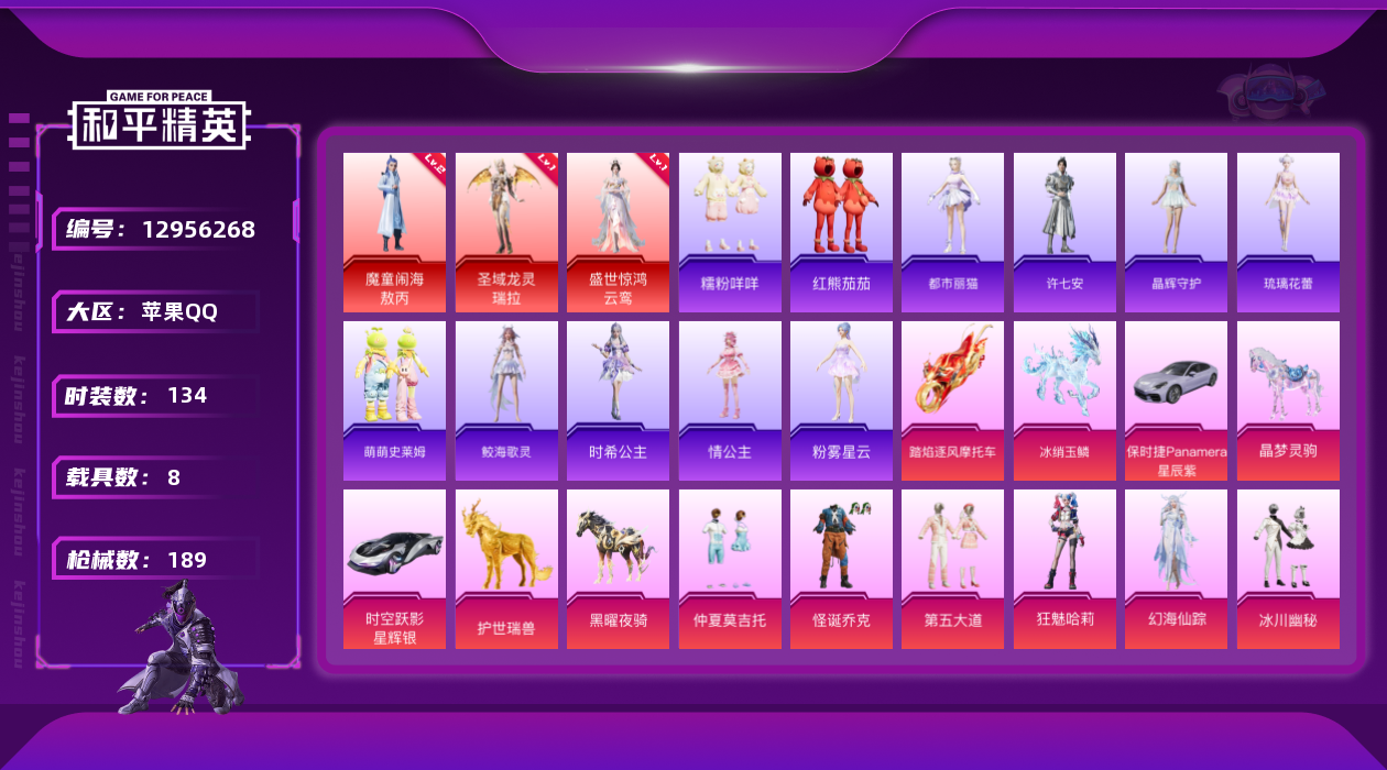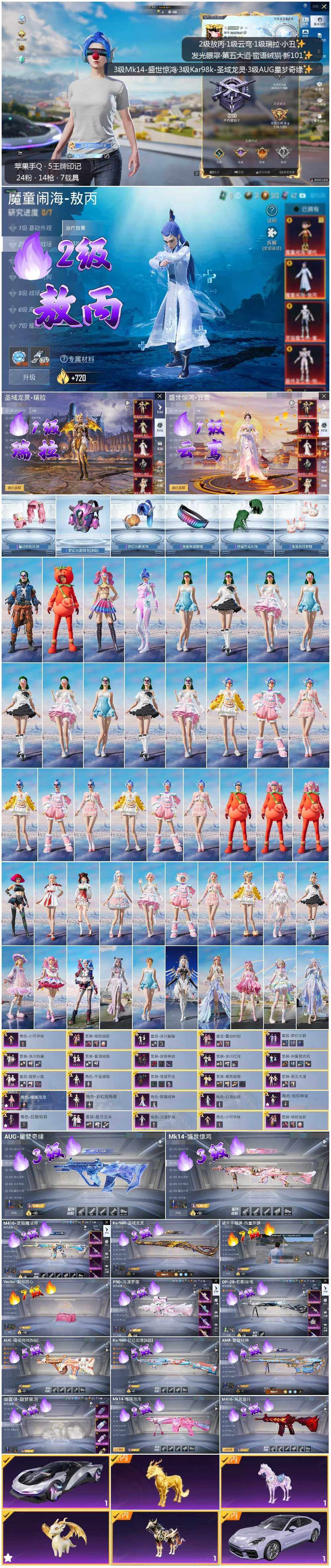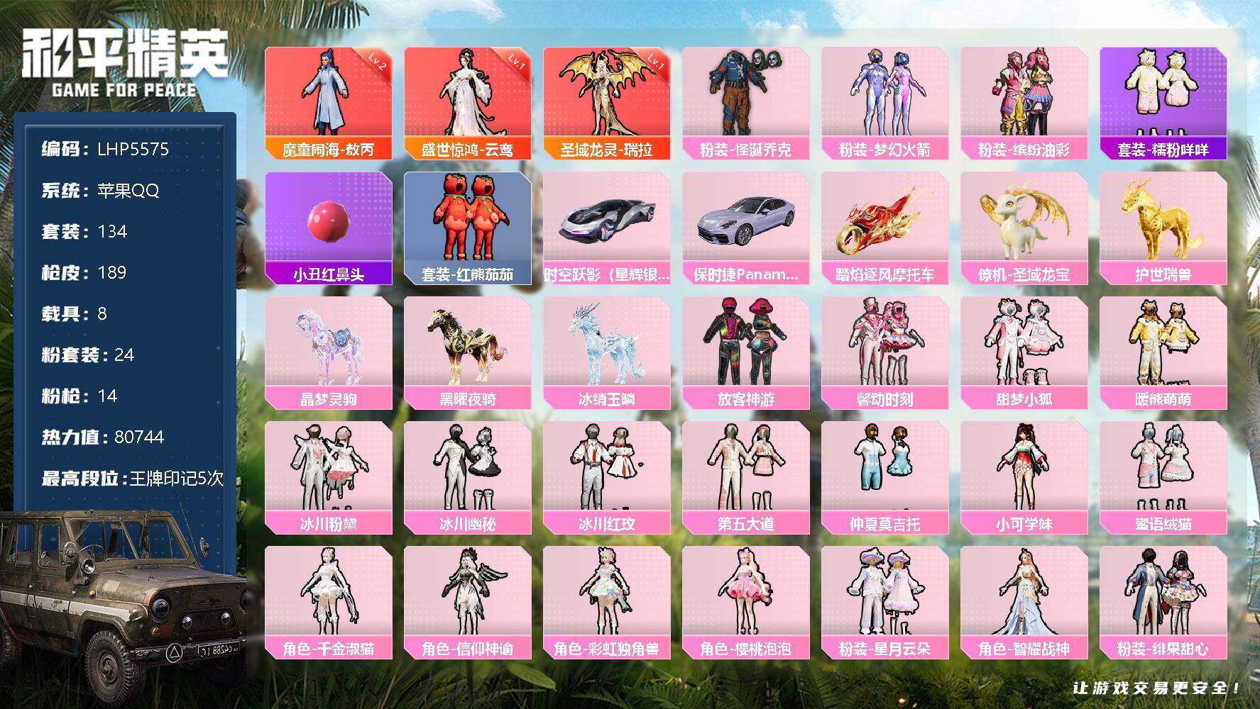 [12956268]素材身法号 苹果 手Q-3神装-24粉装-14特效枪-8载具-14粉色飞行器-8w热力值-5王牌印记-134套装-189枪皮【红色神装等级】:魔童闹海-敖丙(二级),圣域龙灵-瑞拉(一级),盛世惊鸿-云鸾(一级)【热门品类】:粉装-怪诞乔克,粉装-梦幻火箭,粉装-缤纷油彩,套装-糯粉咩咩,小丑红鼻头,套装-红熊茄茄【粉色载具】:时空跃影(星辉银),保时捷Panamera(星辰紫),踏焰逐风摩托车,僚机-圣域龙宝,护世瑞兽,晶梦灵驹,黑曜夜骑,冰绡玉鳞【粉色套装】:粉装-怪诞乔克,粉装-梦幻火箭,粉装-缤纷油彩,粉装-放客神游,粉装-馨动时刻,粉装-甜梦小狐,粉装-暖熊萌萌,粉装-冰川粉黛,粉装-冰川幽秘,粉装-冰川红玫,粉装-第五大道,粉装-仲夏莫吉托,角色-小可学妹,粉装-蜜语绒猫,角色-千金淑猫,角色-信仰神谕,角色-彩虹独角兽,角色-樱桃泡泡,粉装-星月云朵,角色-智耀战神,粉装-绯果甜心,角色-幻海仙踪,角色-狂魅哈莉,角色-冷漠罗丽【粉色枪皮等级】:M416-风花雪月(二级),M416-灵猫魔法师(三级),AUG-星梦奇缘(三级),AUG-暖羊咩咩(五级),Vector-飒粉甜心(七级),P90-冷漠罗丽(五级),Kar98K-巳巳如意(五级),Kar98K-圣域龙灵(三级),Mk14-盛世惊鸿(三级),Mk14-樱桃泡泡(二级),AMR-智耀战神(四级),DP-28-豹影疾电(五级),烟雾弹-甜梦果泡(四级),破片手榴弹-热量炸弹(七级)【粉色飞行器】:酣梦熊熊飞行器,暗翼战神飞行器,萌物绒绒飞行器,镜域双华-灵镜之阶,龙翔九天飞行器,星梦奇缘飞行器,凤舞九天飞行器,万象金身飞行器,彩虹独角兽飞行器,圣域金龙飞行器,绯果甜心飞行器,灵猫魔法师飞行器,飞天猪飞行器