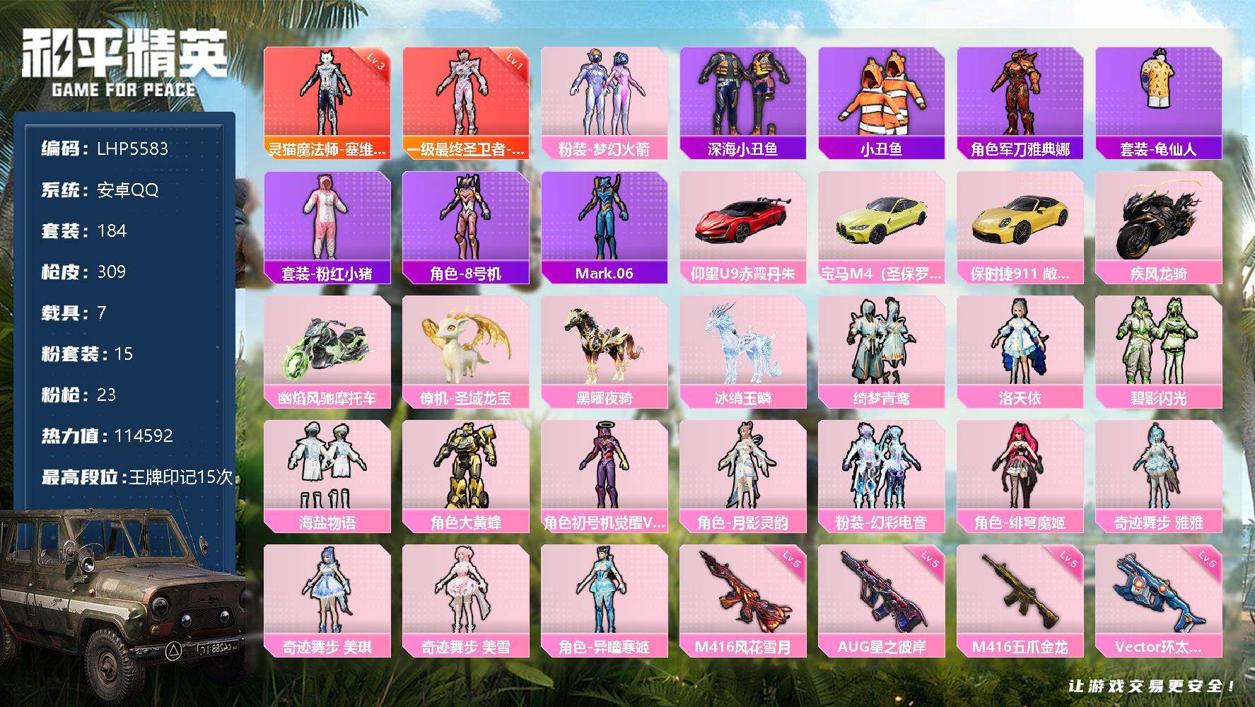 [12956318]安卓 手Q-2神装-15粉装-23特效枪-7载具-16粉色飞行器-114592热力值-15王牌印记-184套装-309枪皮【红色神装等级】:灵猫魔法师-塞维尔(三级),最终圣卫者-帕修斯(一级)【红色角色神装】:灵猫魔法师-塞维尔,最终圣卫者-帕修斯【热门品类】:粉装-梦幻火箭,套装-深海小丑鱼,套装-小丑鱼,角色-军刀雅典娜,套装-龟仙人,套装-粉红小猪,角色-8号机,角色-Mark.06【粉色载具】:仰望U9(赤霞丹朱),宝马M4(圣保罗黄),保时捷911 敞篷版(极速黄),疾风龙骑,幽焰风驰摩托车,僚机-圣域龙宝,黑曜夜骑,冰绡玉鳞【粉色套装】:粉装-梦幻火箭,粉装-绮梦青鸾,角色-洛天依,粉装-碧影闪光,粉装-海盐物语,角色-大黄蜂,角色-初号机 觉醒Ver.,角色-月影灵韵,粉装-幻彩电音,角色-绯穹魔姬,角色-奇迹舞步 雅雅,角色-奇迹舞步 美琪,角色-奇迹舞步 美雪,角色-异瞳寒姬【粉色枪皮等级】:AKM-星际浪客(一级),AKM-魔法神域(一级),AKM-幽焰骑士(五级),SCAR-L-魔童闹海 哪吒(二级),M416-五爪金龙(五级),M416-风花雪月(五级),M416-墨龙九天(一级),M416-灵猫魔法师(三级),GROZA-镜光银凌(五级),AUG-星之彼岸(五级),蜜獾-异瞳寒姬(二级),UMP45-宁雨蝶(三级),Vector-环太平洋(五级),Vector-最终圣卫者(三级),Vector-绯穹魔姬(三级),AKS-74U-信仰神谕(四级),Kar98K-巳巳如意(五级),Kar98K-圣域龙灵(三级),Mk14-甜梦熊击(五级),SVD-月影灵韵(二级),DP-28-豹影疾电(五级),镰刀-幽影之判(五级),破片手榴弹-美味星星糖(五级)【粉色枪皮】:AKM-星际浪客,AKM-魔法神域,AKM-幽焰骑士,SCAR-L-魔童闹海 哪吒,M416-五爪金龙,M416-风花雪月,M416-墨龙九天,M416-灵猫魔法师,GROZA-镜光银凌,AUG-星之彼岸,蜜獾-异瞳寒姬,UMP45-宁雨蝶,Vector-环太平洋,Vector-最终圣卫者,Vector-绯穹魔姬,AKS-74U-信仰神谕,Kar98K-巳巳如意,Kar98K-圣域龙灵,Mk14-甜梦熊击,SVD-月影灵韵,DP-28-豹影疾电,镰刀-幽影之判,破片手榴弹-美味星星糖